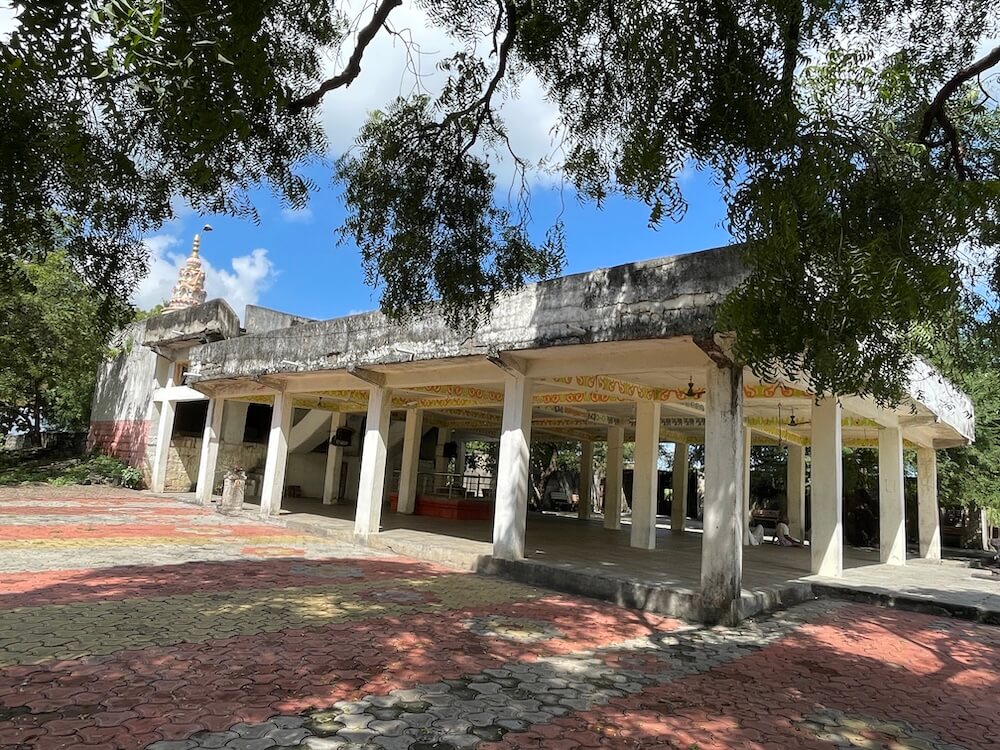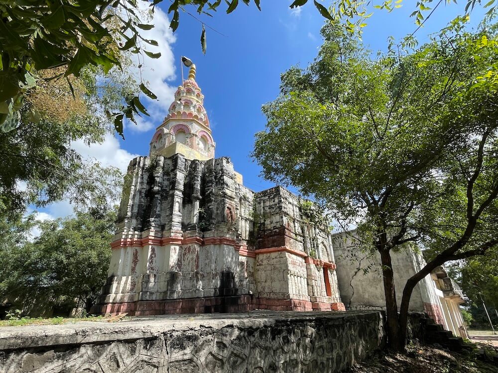 पुढे उंच अधिष्ठानावर हेमाडपंती शैलीतील दगडी बांधकाम व त्यावर विटांचे बांधकाम असलेले प्राचीन मंदिर आहे. दर्शनमंडपापेक्षा अर्धमंडप उंचावर असल्यामुळे सुमारे दहा पायऱ्या चढून मंदिरासमोरील उंच चौथऱ्यावर व येथून दर्शनमंडपाच्या वरील मजल्यावर जाण्यासाठी स्वतंत्र पायऱ्या आहेत. चौथऱ्यापेक्षा अर्धमंडप काही इंच उंच आहे. अर्धमंडपात पाषाणी स्तंभपादावर चौकोनी लाकडी स्तंभ आहेत.