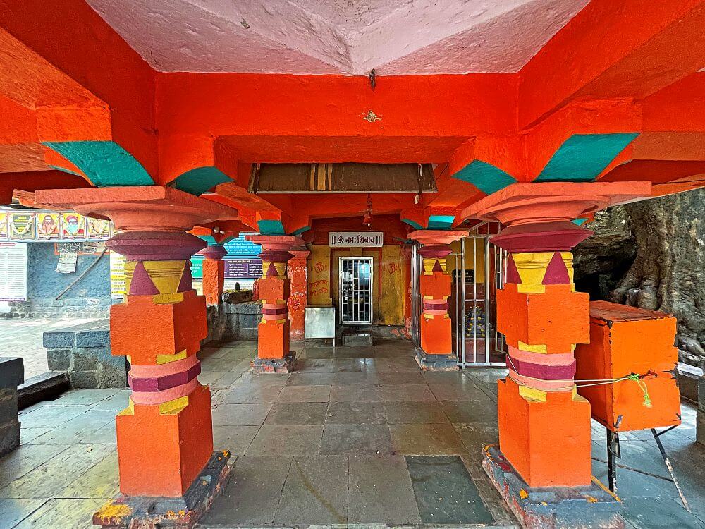 मंदिराच्या प्रांगणात असलेल्या तुलसी वृंदावनाच्या शेजारी नाग शिल्प व नंदीची मूर्ती आहे. याठिकाणी काही समाधी स्थळेही आहेत. त्यांच्या बाजूलाच असलेल्या गुहेत शिवपिंडी आहे. येथून पुढे मंदिराचा सभामंडप आहे. प्रांगणापेक्षा उंचावर असलेल्या सभामंडपात तीन पायऱ्या चढून यावे लागते. सभामंडपात प्रत्येकी चार नक्षीदार स्तंभांच्या चार रांगा आहेत. बाह्य बाजूचे स्तंभ चौकोनी तर मधल्या रांगांतील सहा स्तंभ हे षट्कोनी, अष्टकोनी, वर्तुळाकार, चौकोनी व त्रिकोणी असे विविध भौमितिक आकाराचे आहेत. स्तंभांवर शीर्षभागी कणी व त्यावर हस्त आहेत. हस्तांवर तुळई व तुळईवर छत आहे. सभामंडपाचे संपूर्ण बांधकाम घडीव दगडात आहे. त्यात शिवगिरी