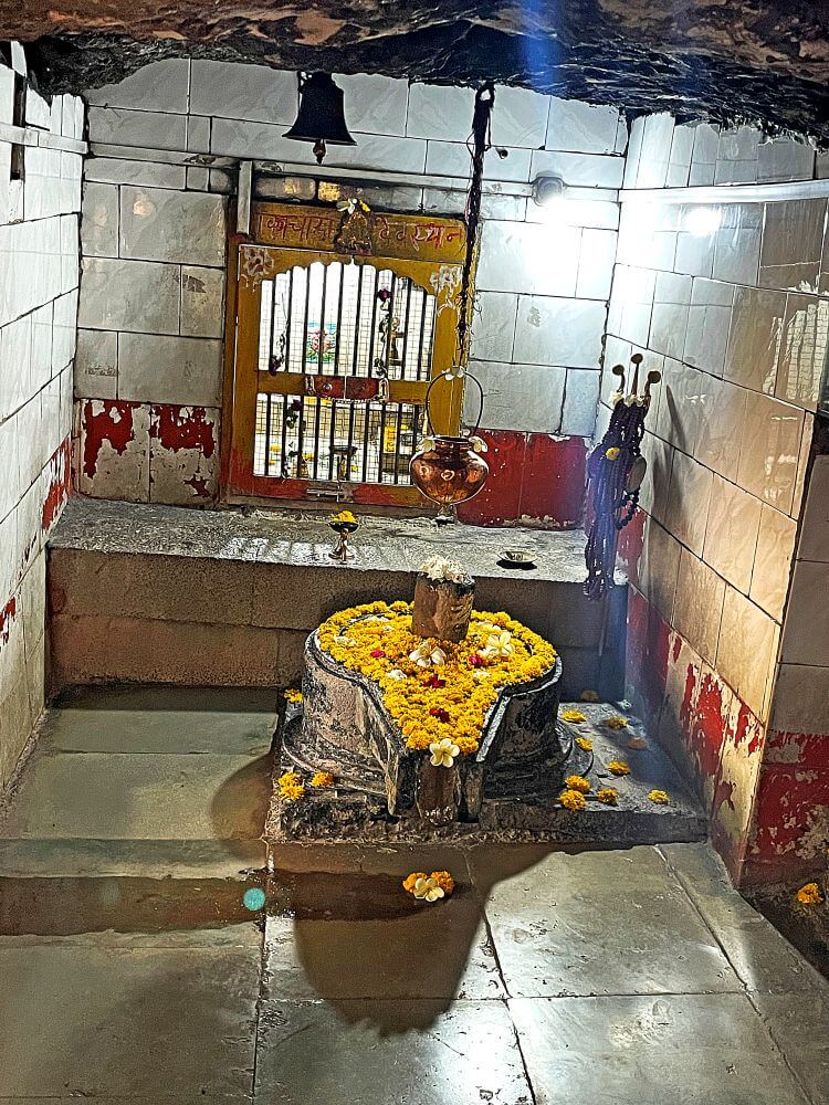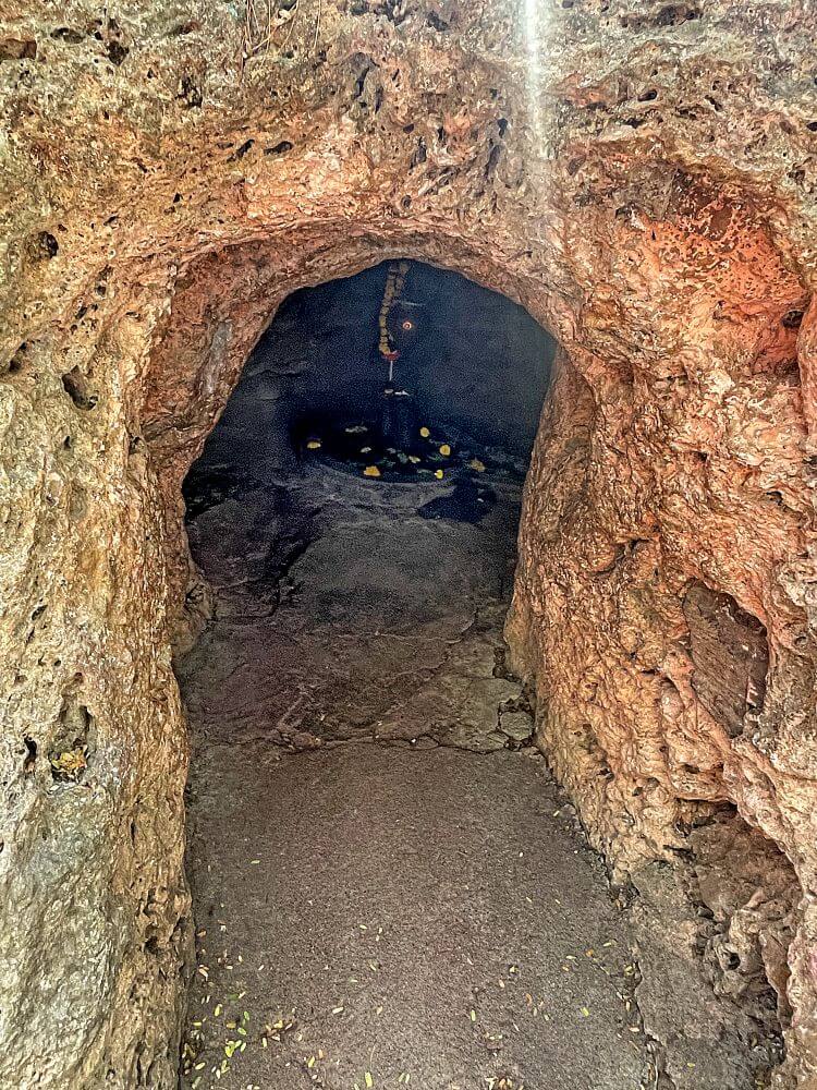 पुढे असलेल्या अंतराळाच्या द्वारशाखेवरील नक्षीकाम व ललाटबिंबावरील शिल्प अस्पष्ट झालेले आहे. अंतराळात वज्रपिठावर शिवपिंडी व भिंतीकडील गुहेत दोन समाध्या आहेत. येथून पुढे गर्भगृहाचे प्रवेशद्वार आहे. गुहासदृश गर्भगृहात एका बाजूला असलेले कातळकडे ही शुकाचार्यांची पाठ असल्याचे सांगितले जाते. भाविक मंदिरात येऊन शुकाचार्यांच्या पाठीचे दर्शन घेऊन आपल्या मनोकामना व्यक्त करतात. येथे शुकाचार्यांचा पितळी मुखवटा आहे. मंदिराला लागून असलेल्या गुहेत यज्ञकक्ष आहे. बाजूला असलेल्या दुसऱ्या गुहेत शुकाचार्यांची ध्यानस्थ मूर्ती आहे.
