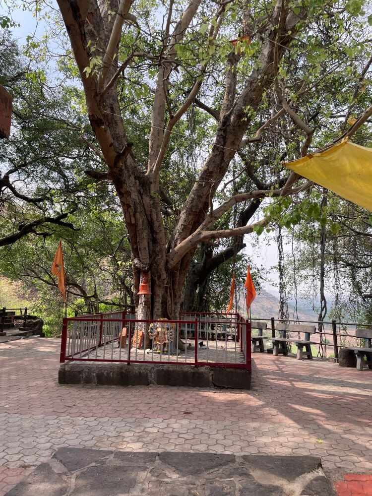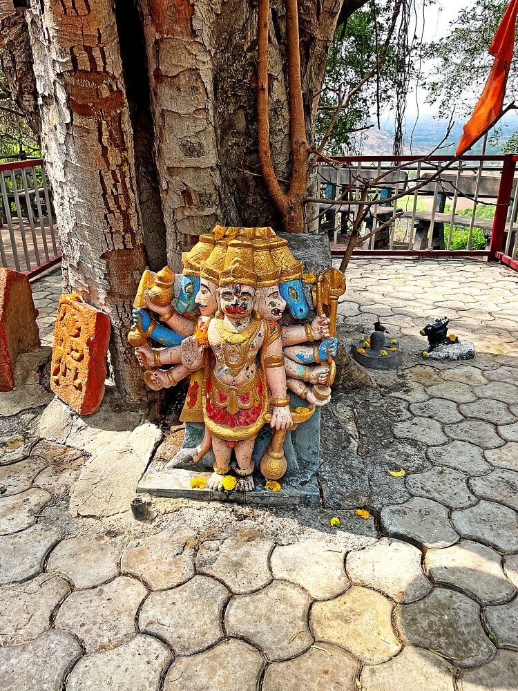 प्रांगणातील वटवृक्षाच्या पाराच्या भिंतीत प्राचीन शिखराचे अवशेष व व्याल शिल्प आहे. या पारावर नाग, पंचमुखी हनुमान मूर्ती, काही भग्न वीरगळ, शिवपिंडी व नंदी आहे. तटबंदीच्या भिंतीतील देवकोष्टकात मारूतीची शेंदूरचर्चित मूर्ती आहे. बाजूलाच देवस्थानच्या पुजाऱ्यांचे निवासस्थान आहे. या निवासस्थानाच्या तळघरात असलेल्या कपारीतील ध्यानगुहेत जाण्यासाठी पाच पायऱ्या आहेत. येथून पुढे लहान चौथरा व त्यावर स्थानिक देवतांचे पाषाण, काही शंख व प्रतिमा आहेत. बाजूलाच डोंगराच्या कातळात कोरलेली दत्तात्रेयांची मूर्ती आहे. पुढे साठवण कक्ष व पुजा साहित्याची दुकाने आहेत. प्रांगणात लोखंडी तटबंदीच्या कडेकडेने भाविकांना बसण्यासाठी आसनांची व्यवस्था आहे. मंदिराच्या प्रांगणातून काही पायऱ्या उतरून हिवतड गावाकडे जाणाऱ्या मार्गावर देवस्थानची गोशाळा व उत्सव काळात वापरला जाणारा रथ ठेवलेला कक्ष आहे.