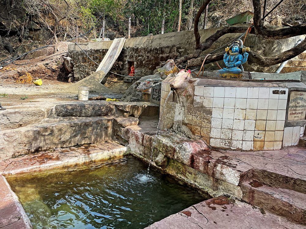 सांगणारा फलक आहे. यापुढे तीन गोमुख आहेत. त्यापैकी एका गोमुखातून पाण्याचा अखंड नैसर्गिक प्रवाह खालील कुंडात पडत असतो. गोमुखाच्या मागे कुंडावर शंकराची व नंदीची मूर्ती आहे. नंदीच्या बाजूला भग्न अवस्थेतील पुरातन वीरगळ आहे. येथील पाण्याने शुचिर्भूत होऊन भाविक मंदिराकडे जातात.