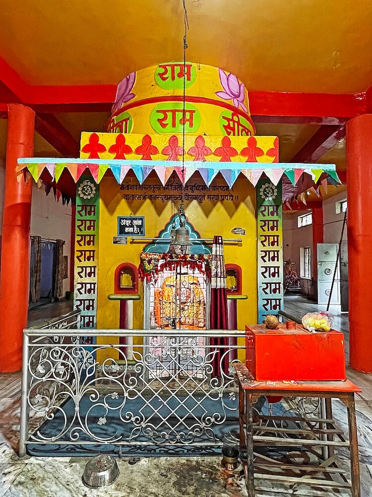 सभामंडपात मध्यभागी हनुमानाचे मुख्य गर्भगृह आहे. या गर्भगृहाच्या एका भिंतीवर पादुकांचे चित्र आहे. गर्भगृहात वज्रपिठावर असलेल्या हनुमानाच्या शेंदूरचर्चित मूर्तीवर मुखवटा आहे. या गर्भगृहाच्या समोर रामदरबार आहे. त्यात श्रीराम, सीता व लक्ष्मण यांच्या संगमरवरी मूर्ती आहेत. याशिवाय श्रीराम लक्ष्मण व सीता यांच्या धातूच्या मूर्तीही येथे आहेत. उत्सवप्रसंगी त्या पालखीत ठेवल्या जातात. मंदिरात राधा-कृष्णाचेही मंदिर आहे. या मंदिराच्या परिसरात येथे तपस्या करणाऱ्या मौनीबाबा महाराज, सूर्यानंद पुरी महाराज आदींच्या मूर्तीही आहेत. या मंदिराच्या छतावर एकूण पाच शिखरे आहेत. मंदिराच्या परिसरात असलेल्या पाकशाळेजवळ एक जुने जाते आहे. या जात्यावर आजही धान्य दळले जाते. त्याचा उपयोग मंदिरात नैवद्य बनवण्यासाठी केला जातो.