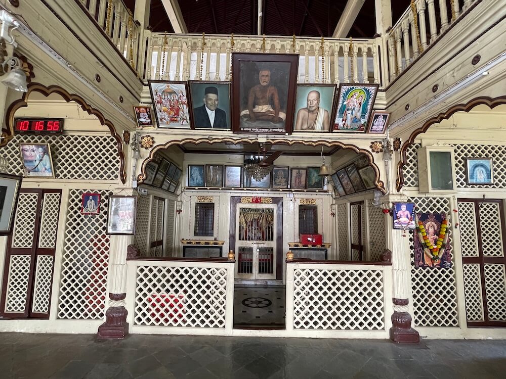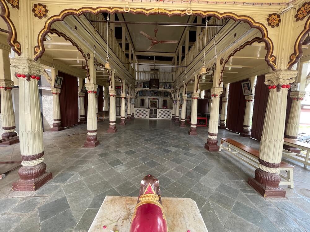 Beneath the seating area of the assembly hall are portraits of Ganpatibua, members of the Paranjpe family and Shrimant Gopalrao Mairal. The walls of the antechamber feature images of various deities, including a notable painting in the style of Raja Ravi Varma titled ‘Yamuna Ghat’. The sanctum has a wooden doorway with a carved image of Ganesh on the lintel. Inside, on a marble pedestal, sits the idol of Ganesh flanked by Riddhi and Siddhi. The self-manifested idol received by Ganpatibua is also placed in front. Siddhanath Ganpati’s trunk bends slightly to the left, despite it being a right-curving trunk,
