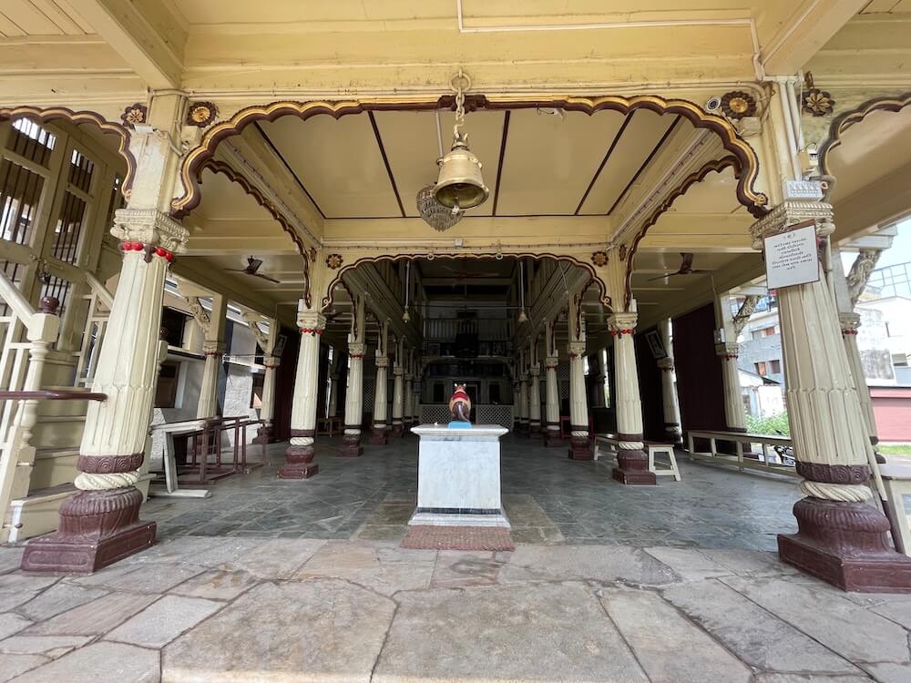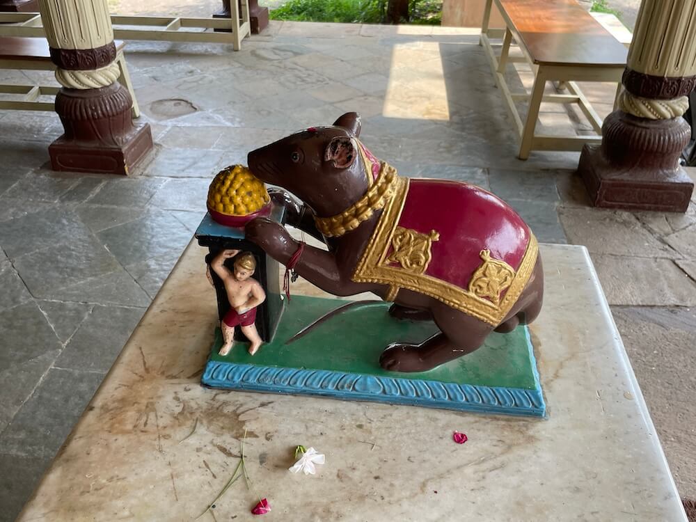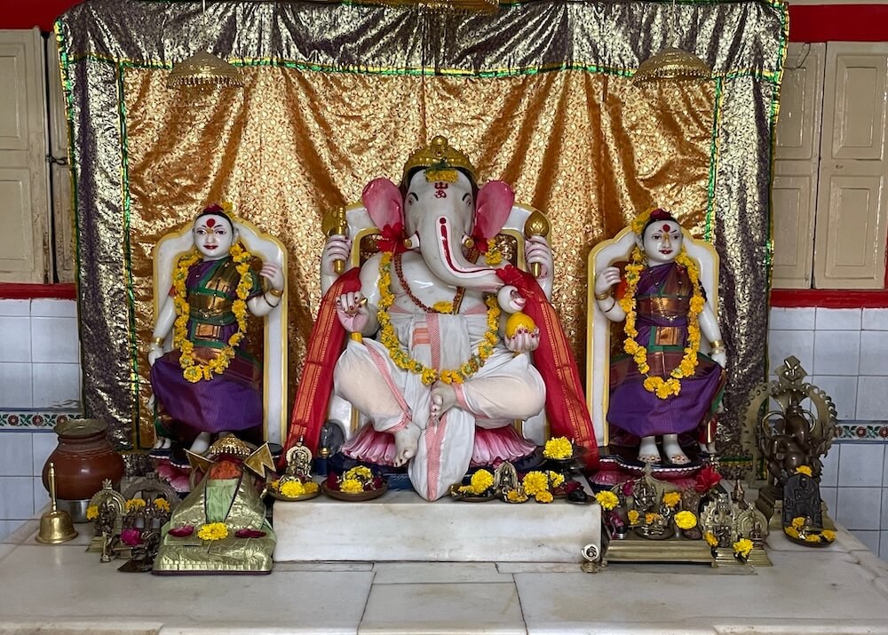 A marble pedestal in the assembly hall holds a statue of Mushak (Ganesh’s mouse mount), in front of which is a platter of modaks being weighed down by smaller figurines.