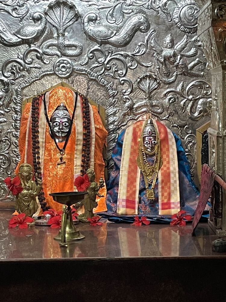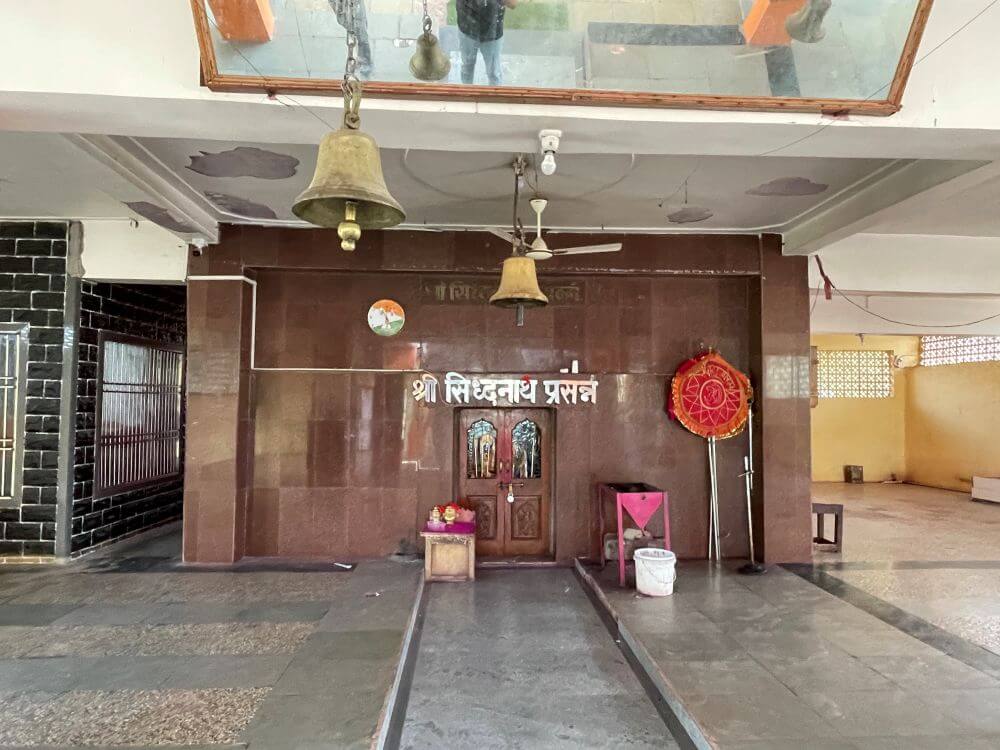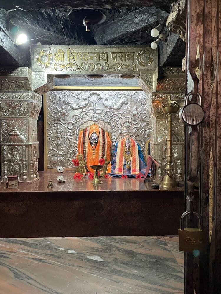 या मार्गावर एका चौथऱ्यावर सिद्धनाथांचे वाहन असलेली घोड्याची मूर्ती आहे. त्यापुढे पितळी कासव आहे. सभामंडपात पुढच्या बाजूला प्रदक्षिणा मार्ग सोडून गर्भगृहाची रचना आहे. येथील गर्भगृह हेच मूळ मंदिर होय. हेमाडपंती स्थापत्यशैलीतील बंदिस्त स्वरूपाच्या या गर्भगृहाला अरुंद प्रवेशद्वार आहे. या प्रवेशद्वाराच्या लाकडी झडपांवर द्वारपालशिल्पे आहेत. या प्रवेशद्वाराजवळ भैरवनाथ व जोगेश्वरी देवीचे उत्सवात वापरले जाणारे पितळी मुखवटे आहेत. गर्भगृहात एका मोठ्या वज्रपिठावर रजतपटल अच्छादित मखरात सिद्धनाथ व जोगेश्वरी देवी यांच्या मूर्ती आहेत. या दोन्ही मूर्तींवर चांदीचे मुखवटे, विविध वस्त्रे व अलंकार आहेत. सिद्धनाथ मूर्तीजवळ गणेशाची पितळी लहान मूर्ती आहे. या दोन्ही मूर्तींच्या मस्तकावर मागील प्रभावळीत पाच फण्यांच्या शेषाची शिल्पे व त्यांच्या दोन्ही बाजूला मयूरनक्षी आहे. मखराच्या दोन्ही स्तंभांवर खालील बाजूला द्वारपालशिल्पे आहेत.