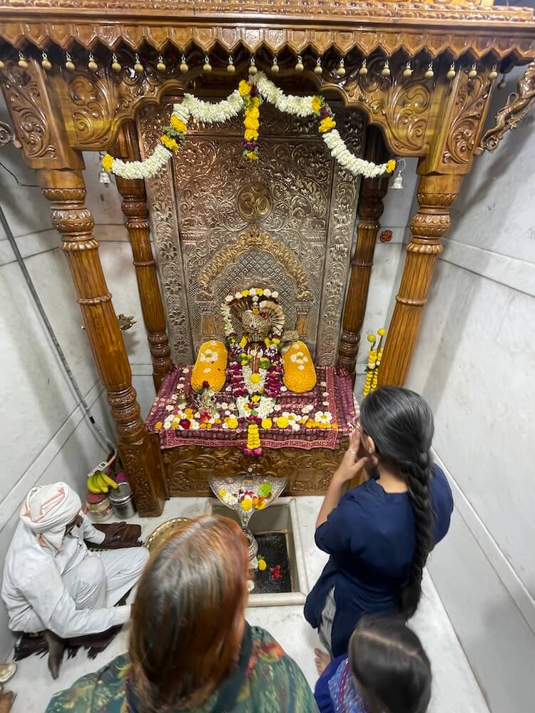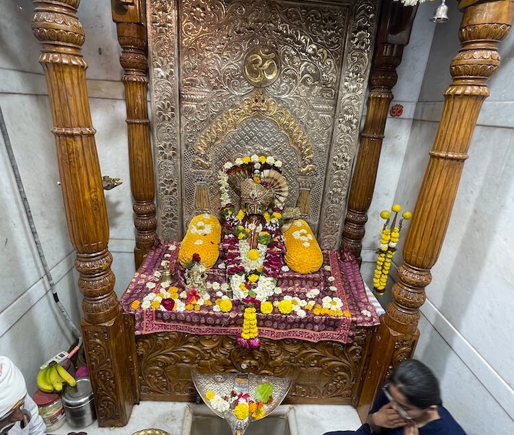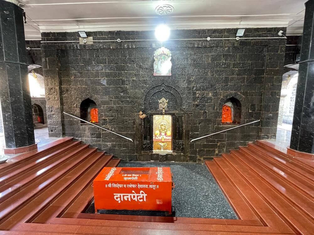 गर्भगृहाचे प्रवेशद्वार कमानदार नक्षीने सुशोभित आहे आणि त्याच्या द्वारशाखांवर स्तंभ तसेच तळाशी द्वारपाल कोरलेले आहेत. ललाटबिंबस्थानी गणपतीची धातूची मूर्ती आहे. गर्भगृहात एका पीठावर सिद्धेश्वरांचा मुखवटा आहे आणि त्यामागे चांदीची महिरप आहे. पीठासमोर संगमरवरी दगडांनी वेढलेला एक चौकोनी खोलगट भाग आहे, त्यामध्ये शिवलिंगाचा आकार दिसतो. त्यावर चांदीच्या फणधारी नागाने तोलून धरलेला अभिषेक कलश आहे.