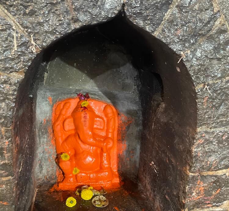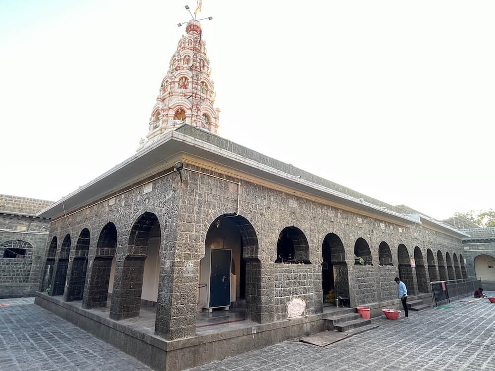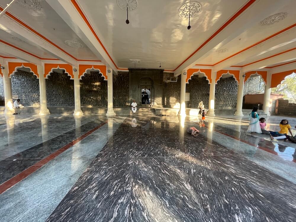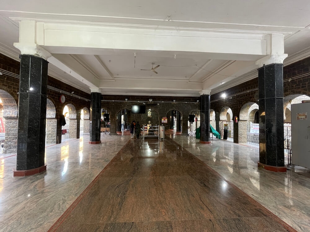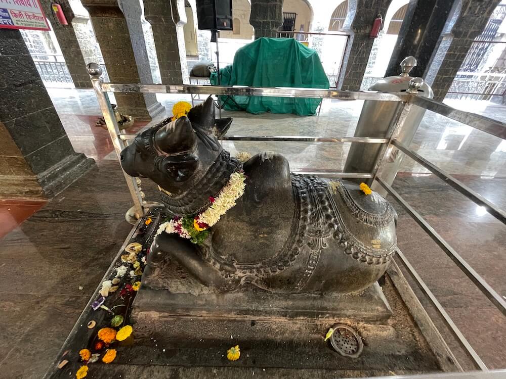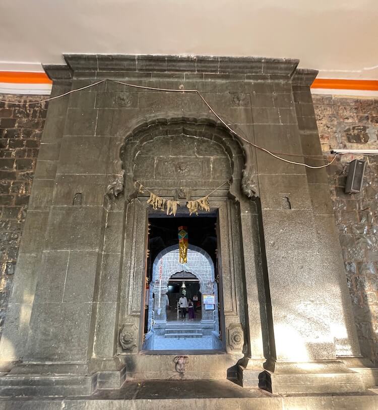 मंदिराच्या मुख्य प्रवेशद्वारातून आत आल्यावर नव्याने बांधलेल्या प्रशस्त कमानदार सभामंडपात प्रवेश होतो. दगडी बांधकामाच्या या सभामंडपात आधुनिक वास्तुकलेच्या खुणा स्पष्टपणे जाणवतात. अनेक खांब आणि महिरपी कमानी असलेल्या या पुरातन वास्तूत आठ पायऱ्या चढून प्रवेश होतो. त्याच्या पुढे आणखी एक दगडी प्रवेशद्वार आहे. त्याच्या ललाटबिंबावर गणेशाची प्रतिमा आहे. त्या प्रवेशद्वारातून पुढे मंदिराच्या मुख्य सभामंडपात प्रवेश होतो. सभामंडपात गर्भगृहासमोर नंदीची मूर्ती आहे. काळ्या पाषाणात घडवलेली ही सुबक नंदीमूर्ती एका दगडी पीठावर स्थापित आहे. मूर्तीवरील दगडी दागिने आणि मुखावरील कोरीव काम वैशिष्ट्यपूर्ण आहे. गर्भगृहाच्या दर्शनी भिंतीत दोन्ही बाजूंच्या देवकोष्टकांत गणपतीच्या मूर्ती आहेत. गर्भगृहाच्या प्रवेशद्वारापर्यंत येण्यासाठी तीन बाजूंनी उतरत्या पायऱ्यांची रचना आहे.