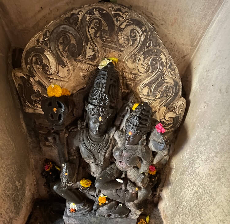 गर्भगृहाच्या प्रदक्षिणा मार्गावर गणपतीसह सप्तमातृकांचे स्थान असलेले देवकोष्टक आहे. गर्भगृहाच्या दोन्ही बाजूंनी छतावर जाण्यासाठी जिने आहेत. या जिन्यांच्या शेजारी एक शंकर-पार्वतीची वैशिष्ट्यपूर्ण मूर्ती आहे आणि दुसरीकडे एक ऐतिहासिक शिलालेख जतन करण्यात आलेला आहे. याच शिलालेखावरून या मंदिराचे बांधकाम साधारण सातशे वर्षांपूर्वी झाल्याचे निश्चित होते. मंदिराच्या सभामंडपाच्या शेजारी गुंफेसारखी रचना असलेल्या एका खोलगट भागात शंकराचे आणखी एक स्थान आहे. तेथील नंदीमूर्तीवरही तपशीलवार कोरीव काम आहे. मंदिराच्या अगदी शेजारी बंदिस्त पायऱ्यांची मोठी पुष्करणी आहे. मंदिर परिसरात आणखीही काही छोटी मंदिरे आहेत. मुख्य मंदिराच्या बाजूलाच तीन मंदिरे आहेत.