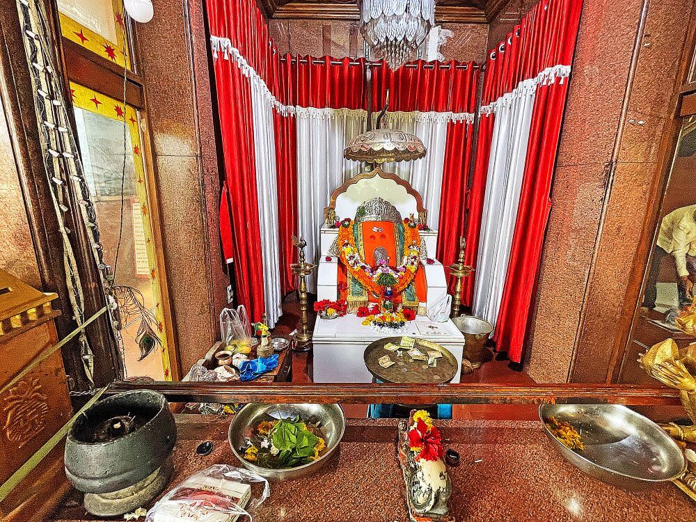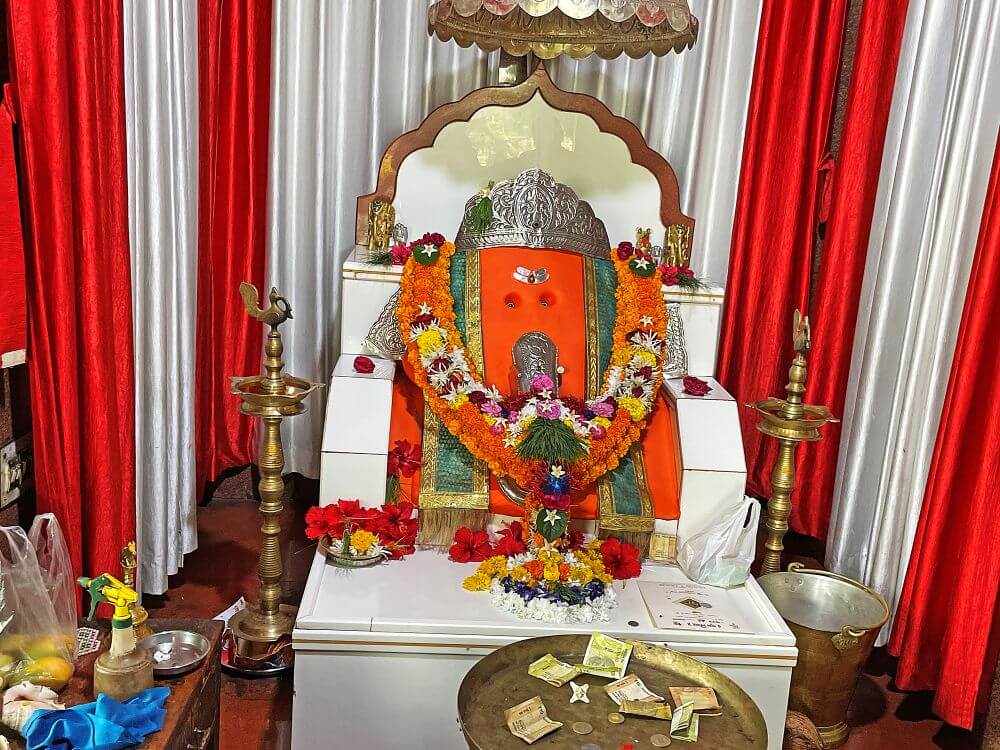 सभामंडप बंदिस्त स्वरूपाचा आहे व त्यात प्रकाश व हवा येण्यासाठी भिंतींमध्ये खिडक्या आहेत. येथील गर्भगृह सभामंडपापेक्षा उंचावर आहे. गर्भगृहाच्या लाकडी द्वारशाखांवर उभ्या धारेची नक्षी आहे. बंदिस्त स्वरूपाच्या गर्भगृहात हवा व सूर्यप्रकाश येण्यासाठी दोन खिडक्या आहेत. गर्भगृहात मध्यभागी वज्रपिठावर महिरपी कमानीने एकमेकांना जोडलेल्या चार चौकोनी स्तंभावर छत असलेल्या मखरात गणेशाची शेंदूरचर्चित पाषाण मूर्ती आहे. मूर्तीचे डोळे भविकांवर कृपाकटाक्ष टाकत असल्याचा भास होतो. गणेशाने डोक्यावर चांदीचा मुकुट धारण केलेला आहे. मूर्तीची सोंड आणि दात चांदीचे आहेत. मूर्तीच्या डोक्यावर चांदीचे छत्र आहे.