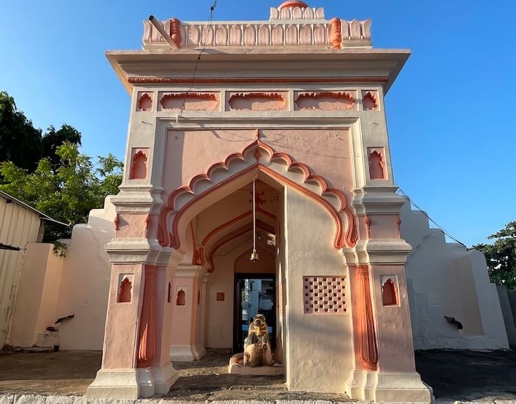 मंदिराच्या बाह्यभिंतींची रचना वैशिष्ट्यपूर्ण आहे. उंच स्तंभांची शेजारी-शेजारी उभी रचना करून या भिंती उभारण्यात आल्या आहेत. कलात्मक स्तंभांतील कलशाकार, त्यांतील कोरीव देवकोष्ठके यांनी गर्भगृहाच्या बाह्यभिंतींचा वरचा भाग सजलेला आहे. या देवकोष्ठकांत विष्णू, हनुमान, नारदमुनी आदींच्या मूर्ती आहेत. रावण हा शंकराचा महान भक्त मानला जातो, म्हणून त्यास गर्भगृहाच्या मागील बाह्यभिंतीतील देवकोष्ठकात स्थान दिलेले आहे. येथे रावणाचे दशमुखी शिल्प आहे. गर्भगृहाच्या या बाह्यभिंतींच्या वर चारही कोपऱ्यांत नंदी शिल्पे बसवलेली आहेत. येथून मंदिराच्या शिखराचा भाग सुरू होतो. हे शिखरही स्तंभांची कलात्मक रचना करून उभारलेले आहे. त्यातील देवकोष्ठकांत गणेश, हनुमान आणि काळभैरवाची मूर्ती आहे. वरच्या भागात चारही बाजूंनी नागशिल्पे आणि मयूरशिल्पे कोरलेली आहेत. शीर्षस्थानी मध्यभागी मोठा कळस आणि त्याच्या चारही बाजूंना चार छोटे कळस, अशा प्रकारे येथे एकूण पाच कळस आहेत.