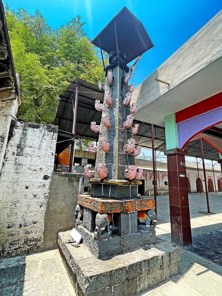सभामंडप, अंतराळ व गर्भगृह अशी या मंदिराची संरचना आहे. खुल्या रचनेच्या येथील सभामंडपातील सर्व स्तंभ महिरपी कमानीने एकमेकांशी जोडलेले आहेत. तटबंदीतील प्रवेशद्वाराजवळ आतील बाजूला एक अखंड तेवणारा नंदादीप आहे. अनेक भाविक नवसपूर्तीनिमित्त यामध्ये तेल टाकतात. या नंदादीपाजवळ एक विरगळ व प्राचिन दगडी नागप्रतिमा आहे. त्यापुढे सभामंडपात एक दगडी चौथरा व त्यावर स्थानिक देवतांचा पाषाण आहे. सभामंडपाच्या दोन्ही बाजुला प्राचिन दीपमाळा आहेत. त्यापैकी एका दीपमाळेचा सर्व भार तळाशी असलेल्या गजमुखशिल्पांनी तोलून धरल्याचे भासते. मुळ मंदिरासमोर हा सभामंडप नंतरच्या काळात बांधलेला जाणवतो. मुळ प्राचीन मंदिर हेमाडपंती स्थापत्यशैलीतील आहे. अंतराळाच्या प्रवेशद्वारासमोर सभामंडपातील एका चौथऱ्यावर नंदीची मूर्ती आहे.