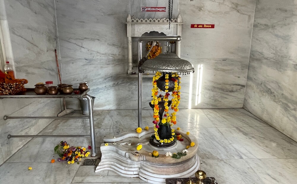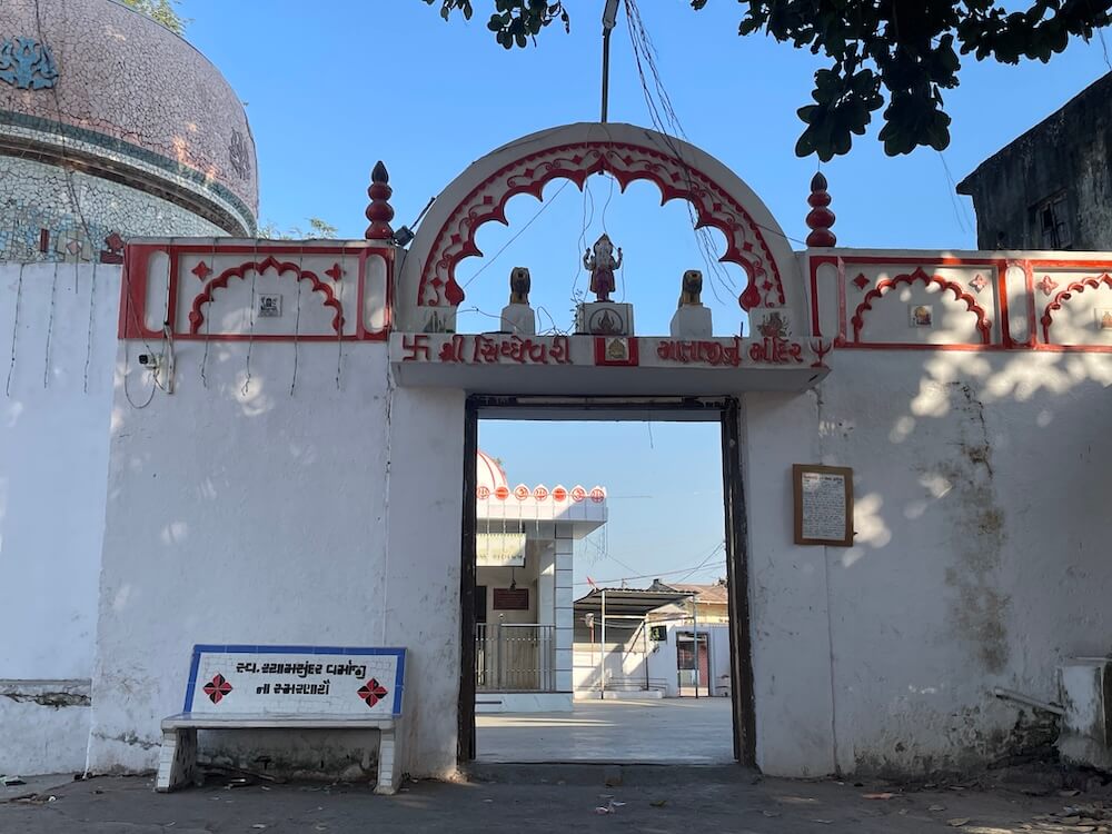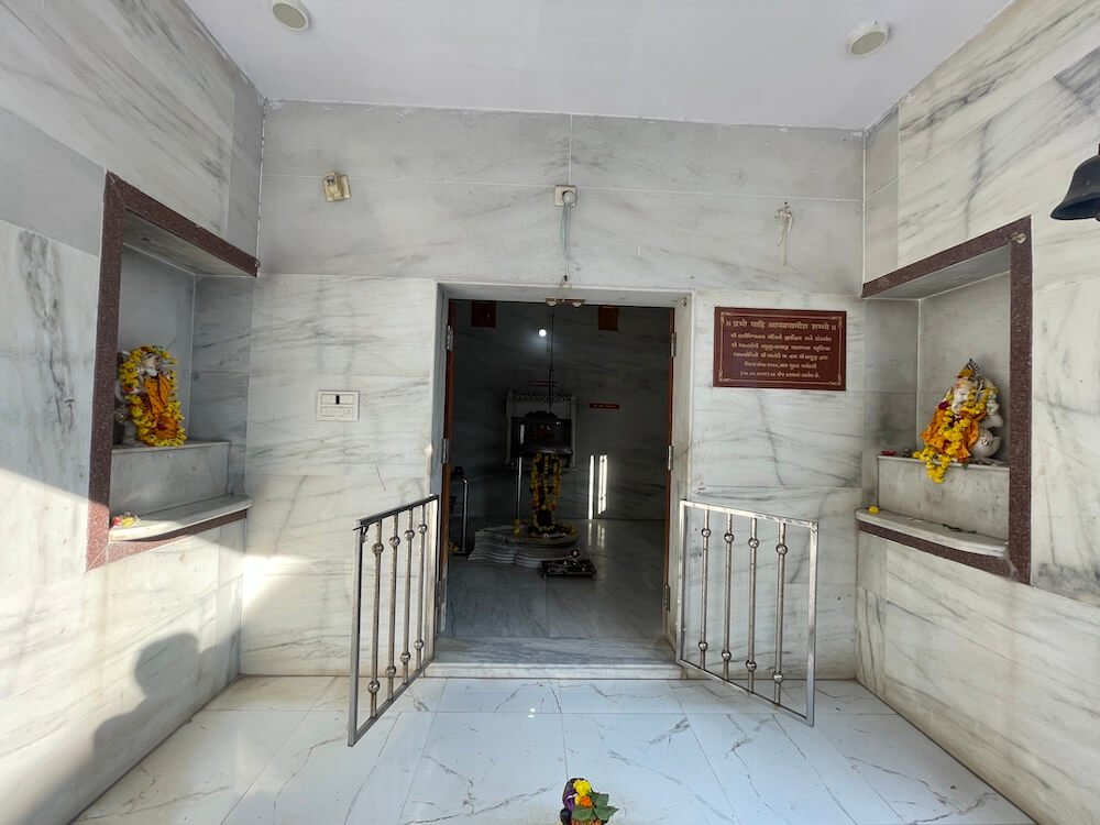 The temple is perched gracefully upon a small hillock on the outskirts of Gadkhol Patiya village. Encircling the grounds is a formidable boundary wall, with a modest entrance featuring a standing figure of Lord Ganesha flanked by two guardian lions. Upon entering, one first beholds the small temple of Kashi Vishwanath Mahadev. This temple, renovated on Magh Shukla Trayodashi, 14 February 2022, has a small Sabha Mandap housing an idol of Nandi. In the inner shrines are sacred places of Ganesh and Hanuman. In the Garbhagriha, within a marble shalunka, is installed the elongated Shivling of Kashi Vishweshwar Mahadev, crowned by a serpent.