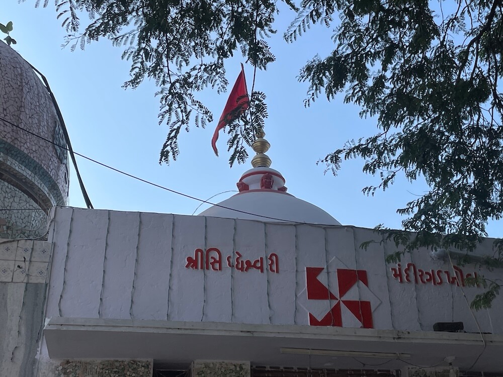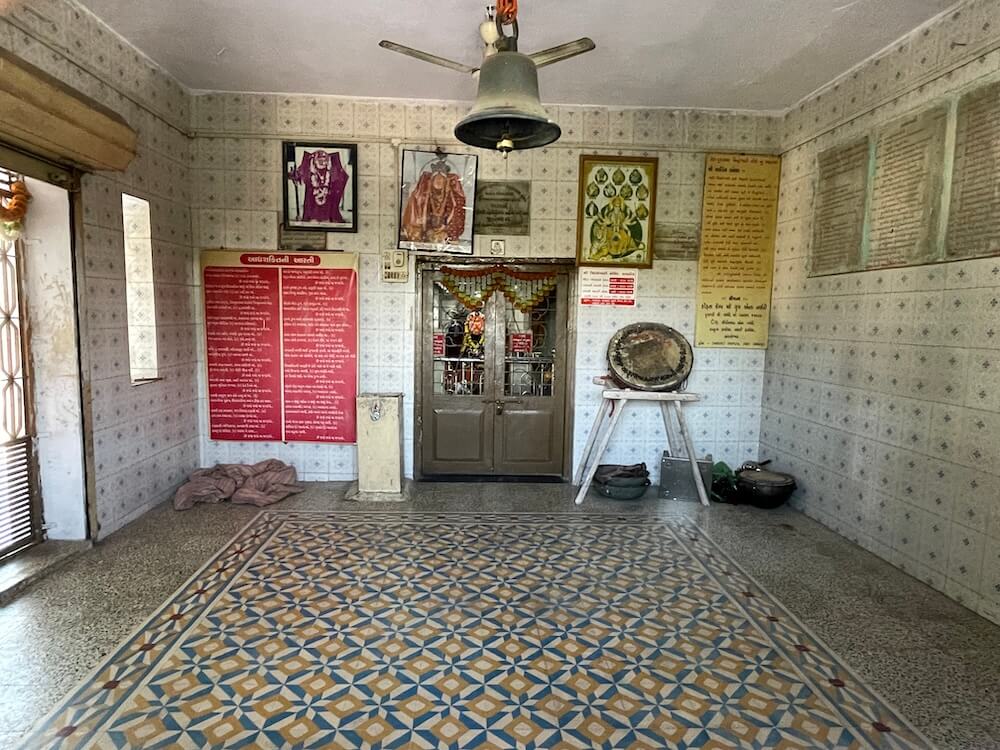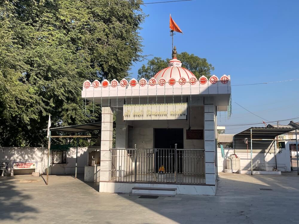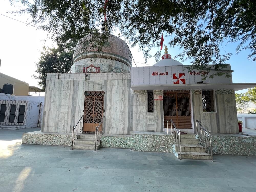 Built on a Jagati (a elevated plinth), the temple comprises a Sabha Mandap and Garbhagriha. In the Sabha Mandap, before the sanctum, stands the lion, Her divine vehicle. In the Garbhagriha, within a marble shrine, rests the sacred circular sindoor-adorned rice symbol of the Goddess, richly decorated with garments and ornaments. The sanctum and mandap are crowned with domed shikharas, beautifully topped with two-tiered amalakas and kalash. Within the courtyard stands an ancient banyan tree. Tradition says that around two hundred years ago, Bhagwan Swaminarayan, founder of the Swaminarayan Sampradaya, meditated beneath this very tree.