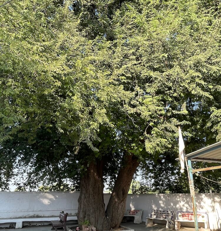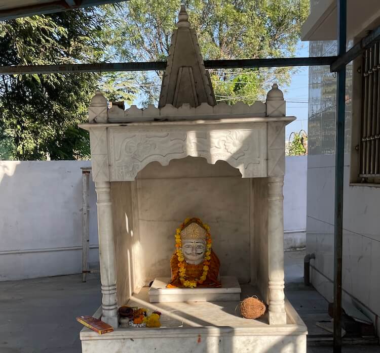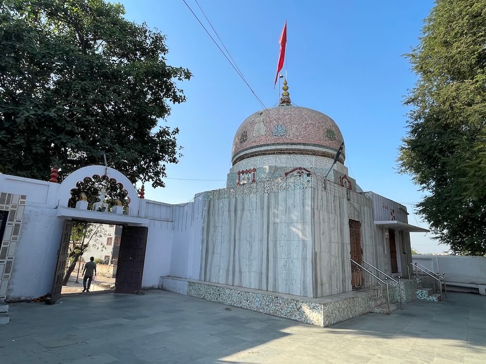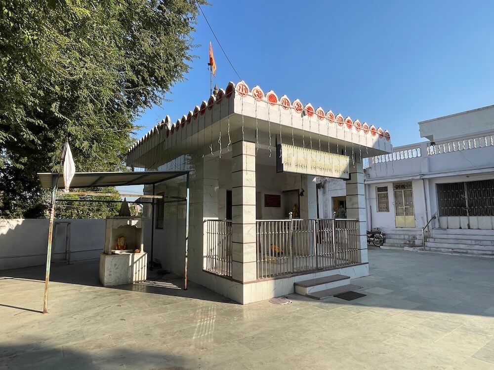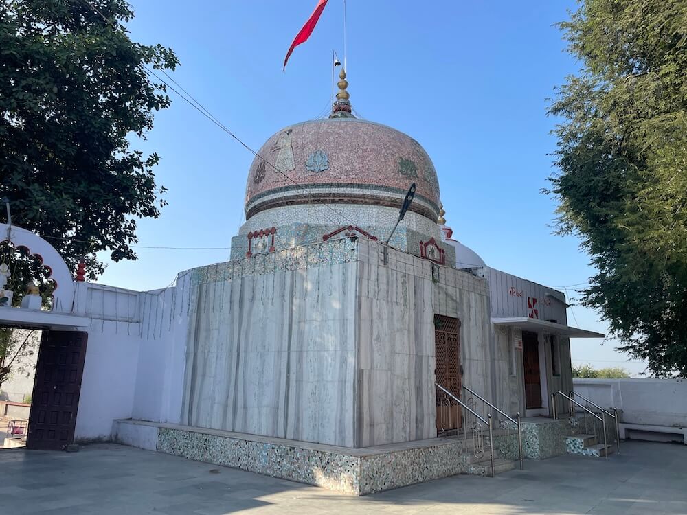 Built on a Jagati (a elevated plinth), the temple comprises a Sabha Mandap and Garbhagriha. In the Sabha Mandap, before the sanctum, stands the lion, Her divine vehicle. In the Garbhagriha, within a marble shrine, rests the sacred circular sindoor-adorned rice symbol of the Goddess, richly decorated with garments and ornaments. The sanctum and mandap are crowned with domed shikharas, beautifully topped with two-tiered amalakas and kalash. Within the courtyard stands an ancient banyan tree. Tradition says that around two hundred years ago, Bhagwan Swaminarayan, founder of the Swaminarayan Sampradaya, meditated beneath this very tree.