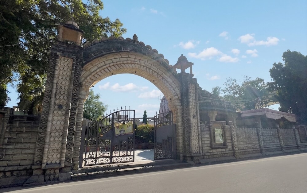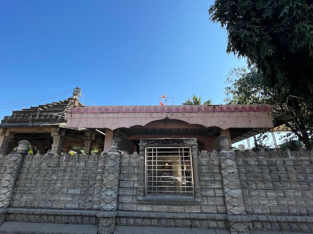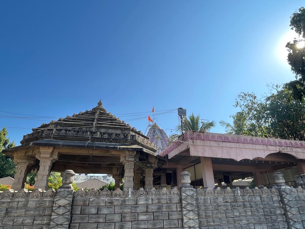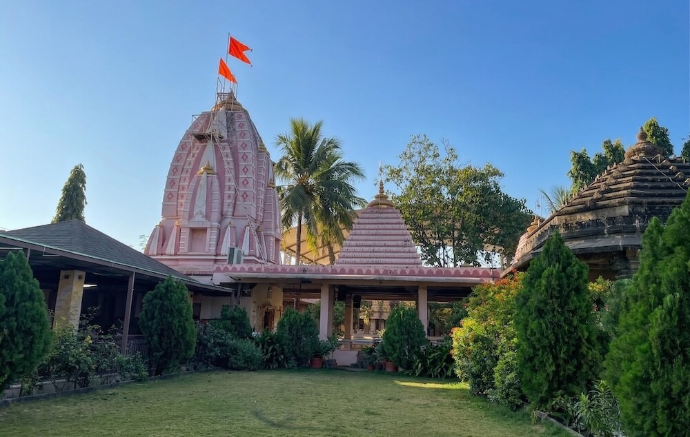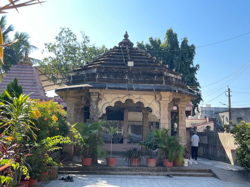 The temple is situated within a serene and expansive compound secured by a high boundary wall and a magnificent entrance arch. The courtyard is graced with a well-maintained garden. To the right stands the Ganesha temple itself. Facing it is an old-style circular pavilion of an open design. Its pillars and arches feature intricate carvings and it is topped by a pyramid-shaped spire adorned with an Amalaka (fluted stone disc) and a Kalash (pinnacle).