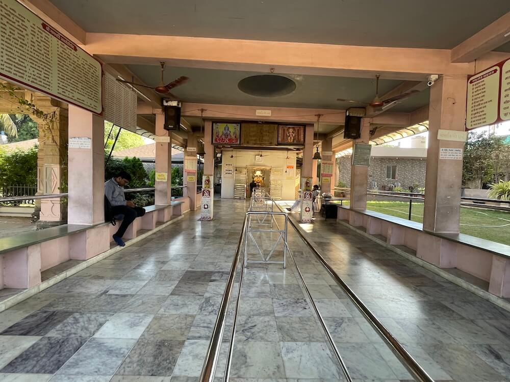 The Siddhivinayak Temple structure comprises a Sabhamandap (assembly hall) and a Garbhagriha (sanctum sanctorum). The Sabhamandap is of a semi-open design and features two spires. Within this elongated hall seating is provided on both sides for pilgrims. A circumambulatory path surrounds the sanctum. Near the entrance to the sanctum stand two pillars topped with statues of Dwarpals (celestial gatekeepers).