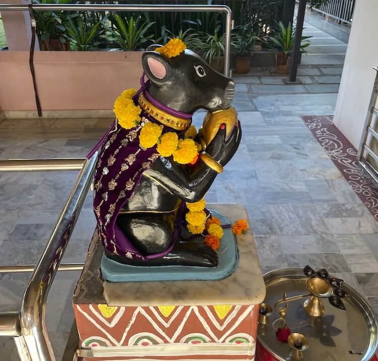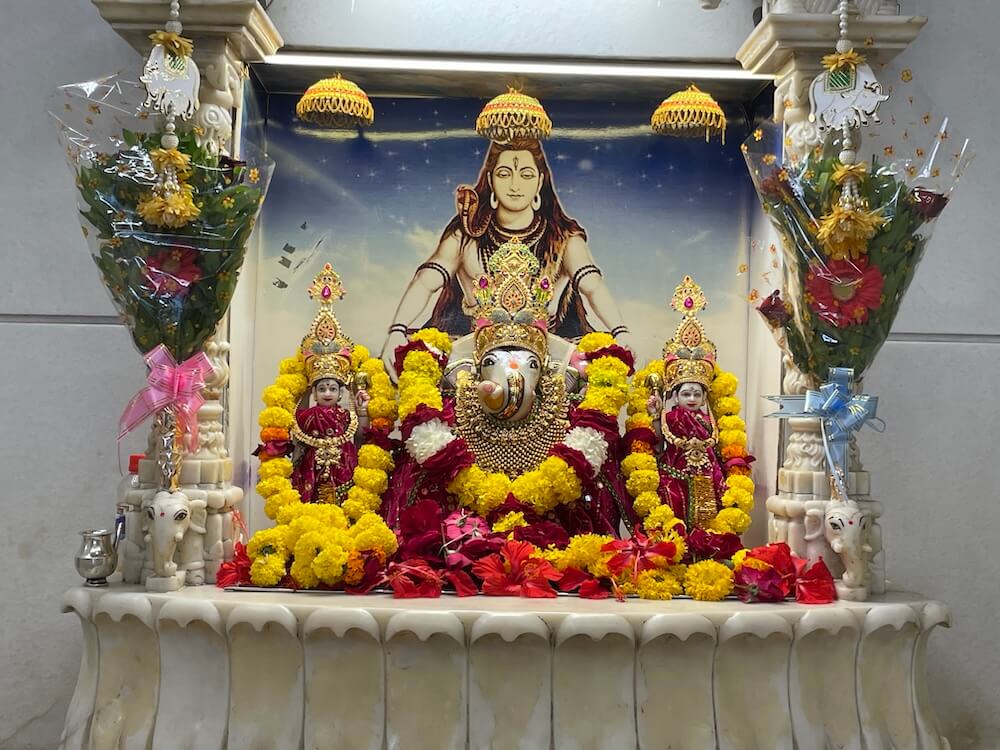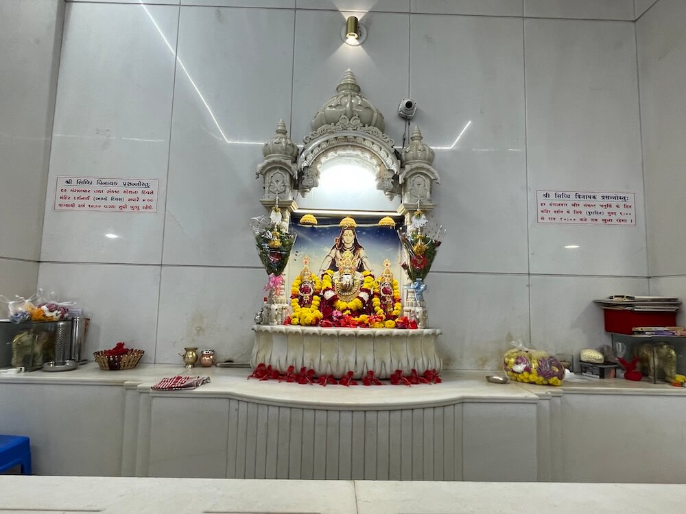 A statue of a mouse, the Lord’s mount, is seated upon a pedestal before the sanctum. Inside, within a beautiful marble canopy atop a high marble platform, resides the marble idol of Siddhivinayak. The idol is elegantly adorned with rich silken garments and jewellery including a heavy gold necklace and a crown studded with precious stones. Flanking him are the marble idols of Riddhi and Siddhi, likewise finely dressed. Behind these figures is a large portrait of Lord Shankar. The sanctum is crowned by an Urushringa style spire featuring a two-tiered Amalaka and a Kalash.