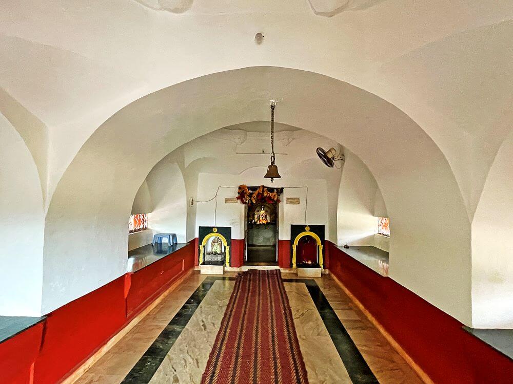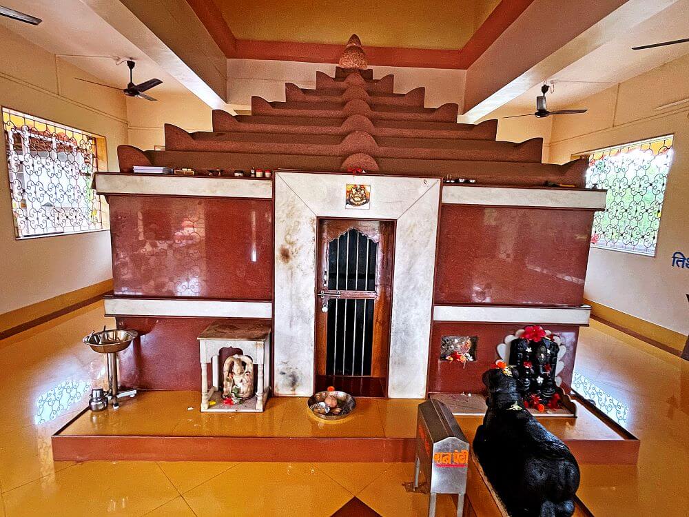 कमानीतून आत गेल्यावर सोमेश्वर मंदिर व शेजारीच जोगेश्वरी देवीचे मंदिर दिसते. २०१० मध्ये केलेल्या जीर्णोद्धारानंतर मंदिराला सध्याचे स्वरूप आलेले आहे. मुख्य मंदिराच्या प्रवेशद्वारासमोर पाच जांभ्या दगडांच्या दीपमाळा, तर एक काळ्या पाषाणातील मोठी दीपमाळ आहे. सभामंडप, अंतराळ व गर्भगृह अशी मंदिराची रचना आहे. हा सभामंडप अर्धमंडप स्वरूपाचा असून बाजूने भाविकांना बसण्यासाठी कक्षासने आहेत. अंतराळात अखंड काळ्या पाषाणातील नंदीची मूर्ती व गर्भगृहाच्या द्वारपट्टीच्या शेजारी श्रीगणेशाची मूर्ती आहे. गर्भगृहात काळ्या पाषाणातील शिवलिंग व त्याच्या मागे महादेवाचा पितळी मुखवटा आहे.