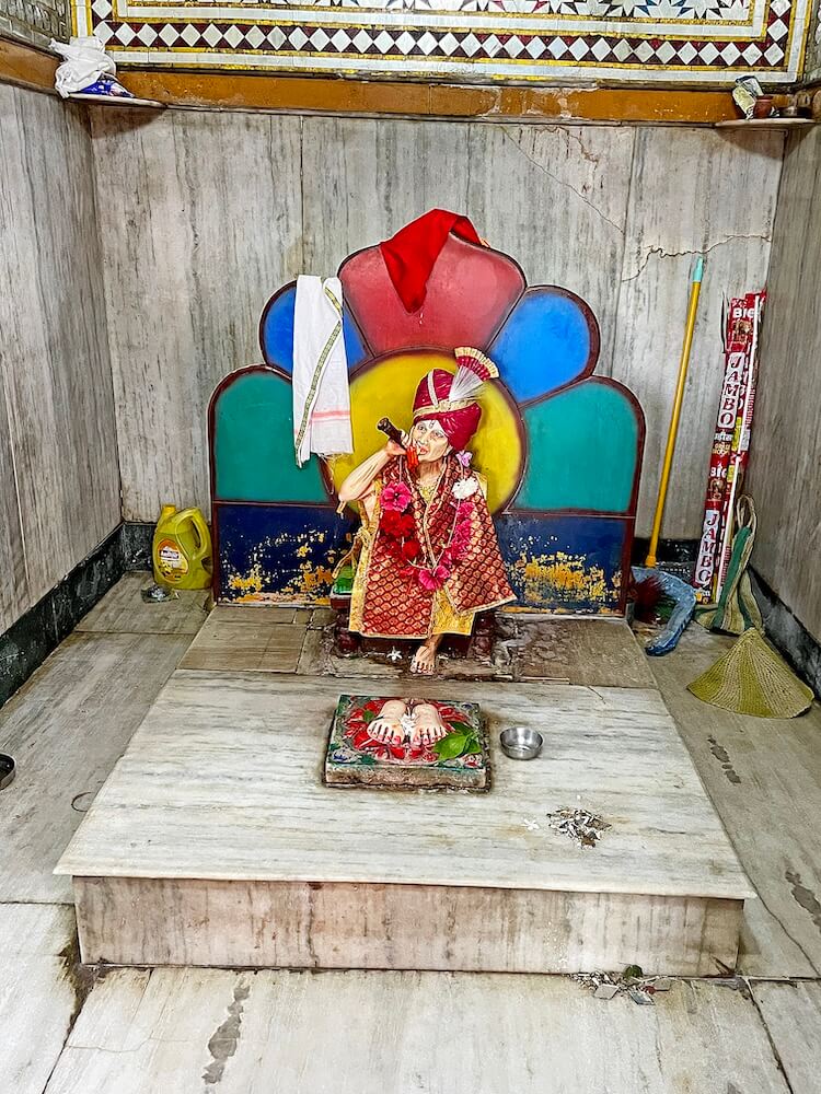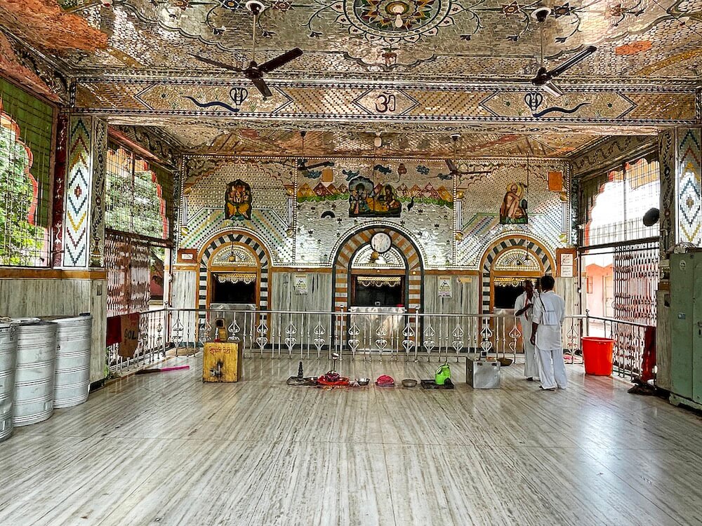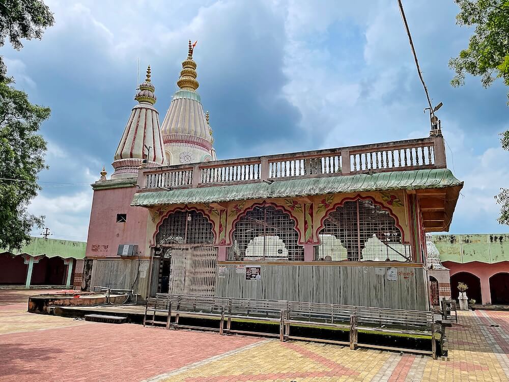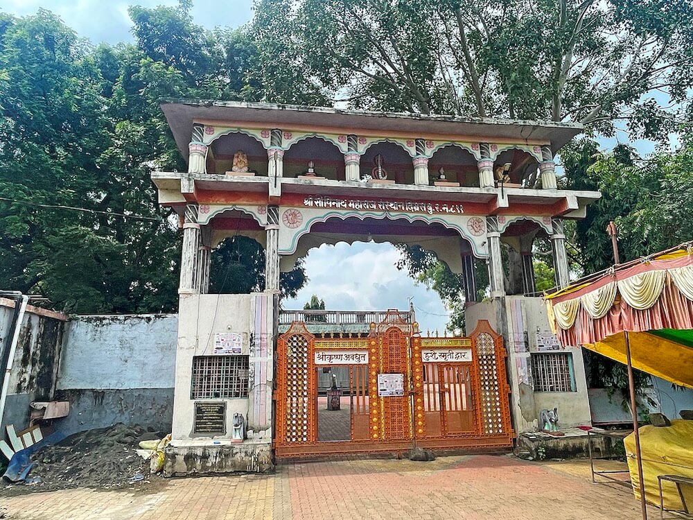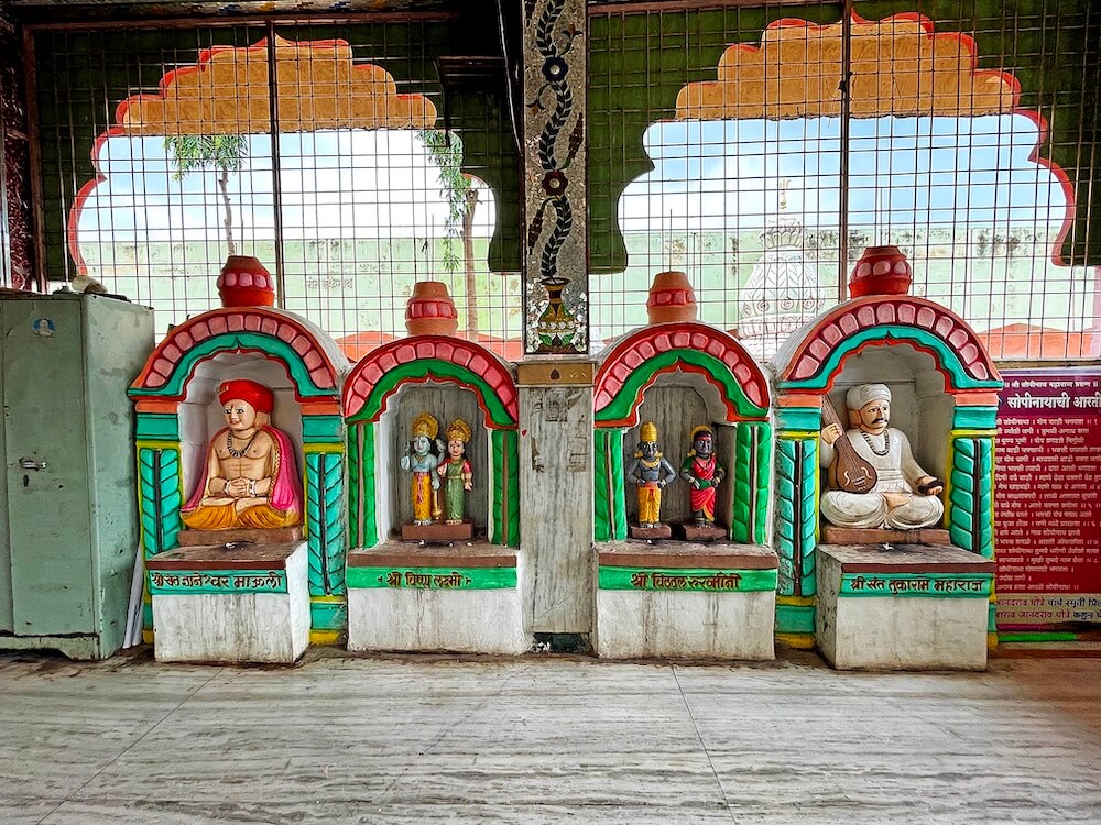 सभामंडपापुढे असलेल्या तिन्ही गर्भगृहांसमोर भाविकांच्या गर्दीचे नियोजन व्हावे यासाठी स्टीलचे रेलिंग आहे. या गर्भगृहांना महिरपी कमानीच्या आकाराची प्रवेशद्वारे आहेत. डावीकडील गर्भगृहात एका मोठ्या आयताकृती वज्रपिठावर गणपतीची मूर्ती आहे. या मूर्तीसमोर देवाच्या पादुका आहेत. मध्यभागी असलेल्या मुख्य गर्भगृहात आयताकृती वज्रपिठावर सोपीनाथ महाराजांचे स्वयंभू स्थान आहे. येथील त्यांची पाषाणमूर्ती शेंदूरचर्चित आहे. या मूर्तीला चांदीचे डोळे आहेत. या स्थानाच्या मागील बाजूस पंचधातूच्या काही शेषनागाच्या मूर्ती आहेत. उजवीकडील गर्भगृहात गजानन महाराजांची मूर्ती आहे.