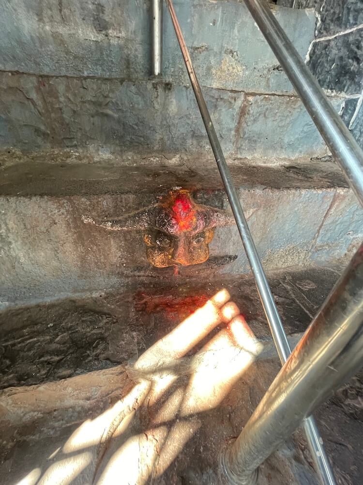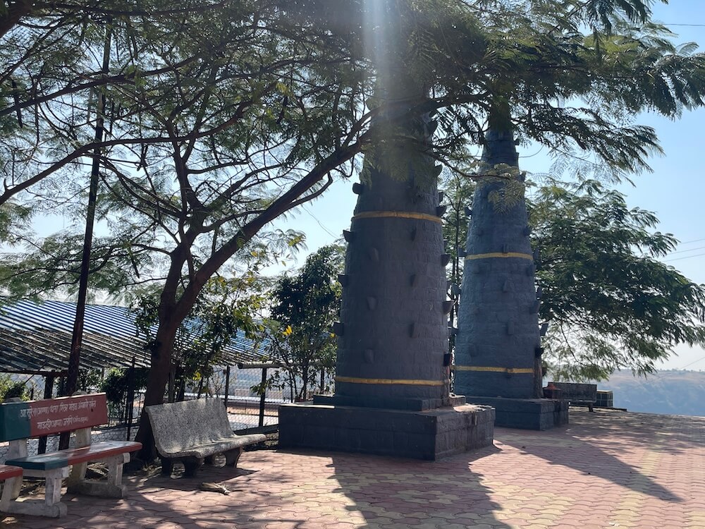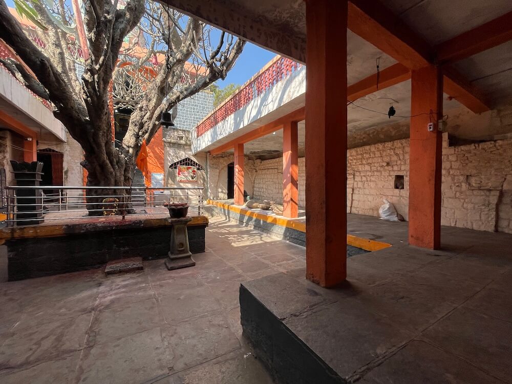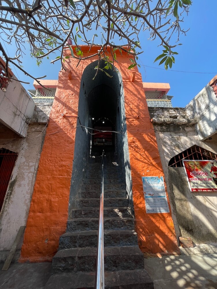 मंदिर उंचावर असल्यामुळे प्रवेशद्वारासमोर कोरीव पाषाणात बांधलेल्या आठ पायऱ्या आहेत. पायऱ्यांच्या दोन्ही बाजूला चौथरे आहेत. उत्सव काळात आराधी, वाघ्या, पोतराज, मुरळी आदी देवीचे सेवक या चौथऱ्यावर बसून देवीची भजने गातात. प्रवेशद्वारासमोर दोन्ही बाजूला पहारेकऱ्यांची आसने आहेत. प्रवेशद्वाराच्या द्वारशाखा नक्षीदार आहेत आणि त्यावरील ललाटबिंबावर गणपतीचे शिल्प आहे. प्रवेशद्वारास नक्षीदार लाकडी झडपा आहेत. मंदिराच्या प्रांगणात तटबंदीला लागून ओवऱ्या आहेत. त्यांचा वापर भक्तनिवास, धर्मशाळा व भाविकांसाठी विश्रांती कक्ष म्हणून केला जातो. प्रांगणात तुलसीवृंदावन आणि त्यापुढे महावृक्षाचा पार आहे.