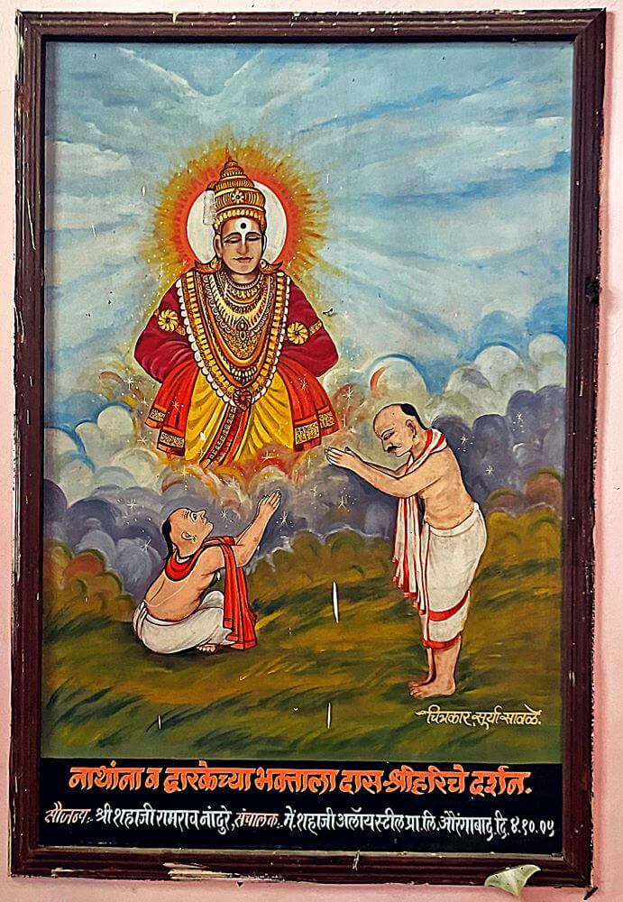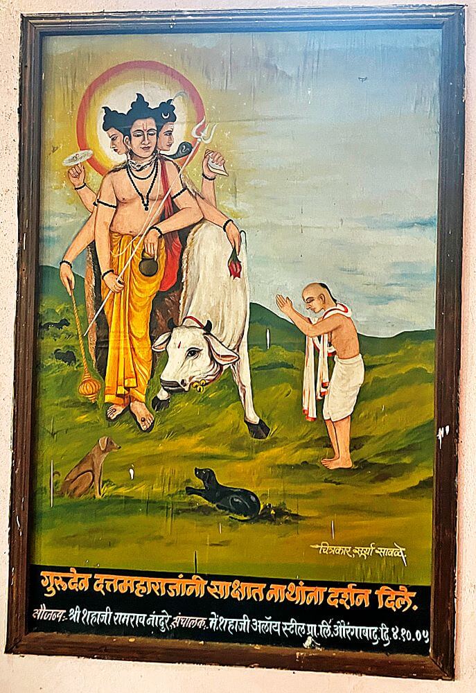 आधात्म्य आणि गुरुसेवा दोन्ही साधत असताना ते तलवारबाजीही शिकले. त्यांची दिवसेंदिवस दृढ होत जाणारी भक्ती आणि त्यांचे संस्कार पाहून संत जनार्दन स्वामींनी एकनाथांना श्रीदत्तात्रेयांचे दर्शन घडवण्याचा निर्णय घेतला. जनार्दन स्वामी नेहमी सुलीभंजन डोंगरावर जाऊन गुरुंशी संवाद साधत. एके दिवशी, गुरुवारी त्यांनी एकनाथांनाही सोबत घेतले. स्नानसंध्या झाल्यावर जनार्दन स्वामी ध्यानाला बसले. त्यावेळी एक मलंग (फकीर) येथे आला. अंगभऱ कातडे पांघरलेल्या त्या फकिराचे डोळे आरक्त होते. सोबत कुत्री आणि तिची पिल्ले होती. मात्र एकनाथांना तेच दत्तात्रेय असल्याची कल्पना नव्हती. काही वेळाने ध्यानातून जागे झालेल्या जनार्दन स्वामींनी त्या फकिराच्या चरणी माथा टेकविला. काही वेळाने त्या फकिराने जनार्दन स्वामींना कुत्रीचे दूध काढून आणायला सांगितले. स्वामींनी तसे केल्यावर फकिराने आपल्या झोळीतून शिळ्या भाकरीचे तुकडे काढून दुधाच्या भांड्यात भिजवले. त्यानंतर तो फकीर आणि जनार्दन स्वामी त्याच भांड्यातून भाकरी खाऊ लागले. खाणे झाल्यावर जनार्दन स्वामींनी एकनाथांना भांडे धुऊन आणण्यास सांगितले. त्यावेळी एकनाथांनी तो फकीर म्हणजेच श्रीदत्तात्रेय असल्याचे जाणले. धुण्यासाठी भांड्यात ओतलेले पाणी स्वतः प्राशन करून त्यांनी ते भांडे धुऊन फकिराच्या हातात दिले आणि त्याला साष्टांग नमस्कार केला. त्यानंतर उठून पाहिले असता त्यांना श्रीदत्तात्रेयांच्या साक्षात रूपाचे दर्शन झाले.