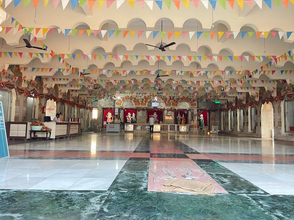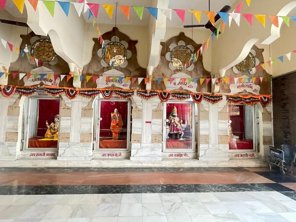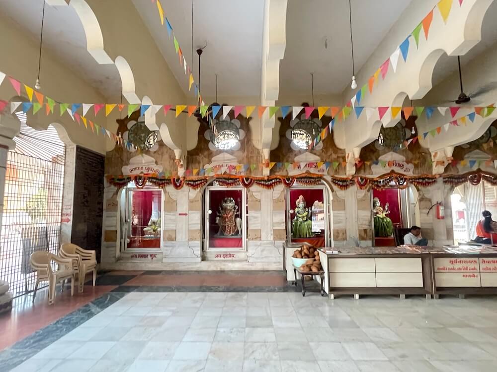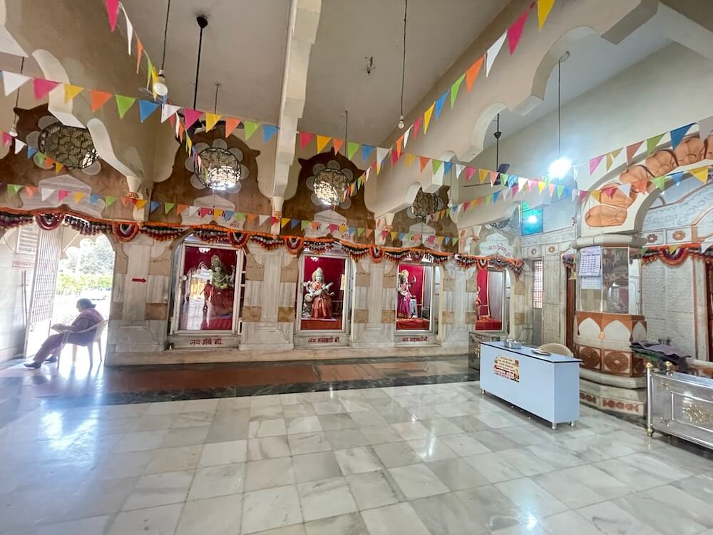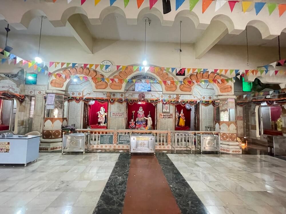 From the darshan mandap, a pradakshina path (circumambulatory passage) runs around the temple. From here, one enters the spacious sabhamandap (assembly hall). Along the left and right walls of this hall are structures resembling subsidiary sanctums in which numerous idols of deities and revered saints have been installed. Among them are images of Bhagavan Buddha, Sai Baba, Dattatreya, Ambamata, Saraswati, Mahakali Devi, Lalji Maharaj, Kupla Nandji Maharaj, Ramdev Pir Baba, Mahavir Swami, Mahatam Ramji, Karuna Sagar and Jalaram Bappa.