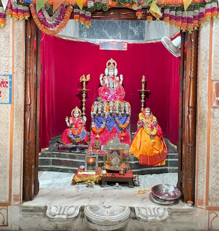 The entrance to the darshan mandap has a semicircular design and the upper portion is adorned with various auspicious motifs. Above this semicircular structure is depicted the radiant form of Surya riding in his chariot drawn by seven swift horses. These seven horses are named Gayatri, Brihati, Ushnik, Jagati, Trishtubh, Anushtubh and Pankti. They are regarded as symbols of positivity, strength and progress. On both sides of this entrance stand sculptures of the dvarapalas (guardian figures). Within the darshan mandap, large niches on the right and left contain idols of Ganapati and Hanuman.