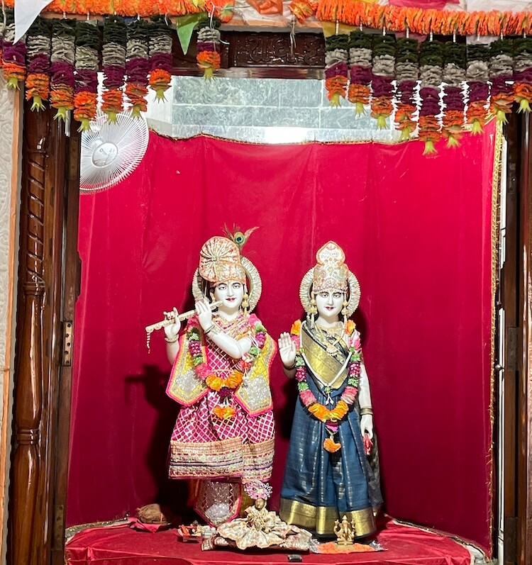 On either side of the deity stand the images of his consorts, Sanjna and Chhaya. In the garbhagriha to the left of the main sanctum are the pure white marble idols of Shri Ram, Lakshmana and Sita. In the adjoining sanctum stands a Shivpinda and before it, upon a vajrapith, are the images of Lord Shiva and Parvati. Outside this sanctum, upon a pedestal, is placed the idol of Nandi. In the first garbhagriha to the right of the principal sanctum are the beautiful marble images of Radha and Krishna. In the sanctum next to it are the idols of Lakshmi and Narayan.