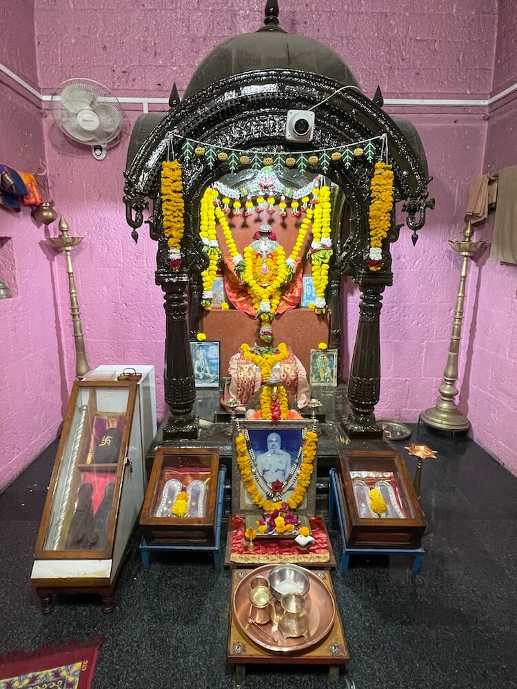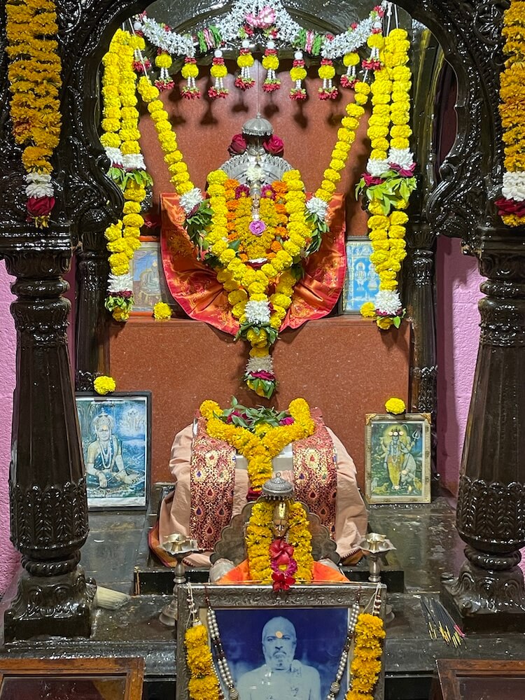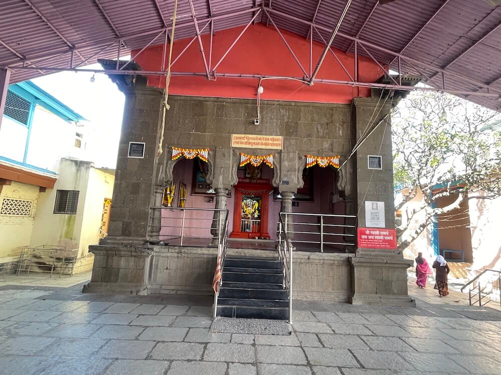 पायऱ्यांच्या दोन्ही बाजूंना व अंतराळात समोरील बाजूला स्टेनलेस स्टीलचा कठडा आहे. अंतराळात समोरील बाजूला चार नक्षीदार स्तंभ एकमेकांना महिरपी तोरणाने जोडलेले आहेत. पद्माकार स्तंभपादावर उभ्या असलेल्या स्तंभांमध्ये शीर्षकमळे आहेत. अंतराळात भिंतीवर स्वामी समर्थांच्या अनेक लहान-मोठ्या प्रतिमा आहेत.
