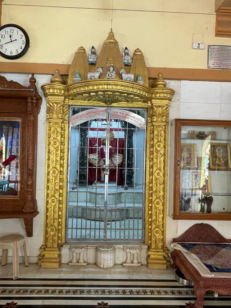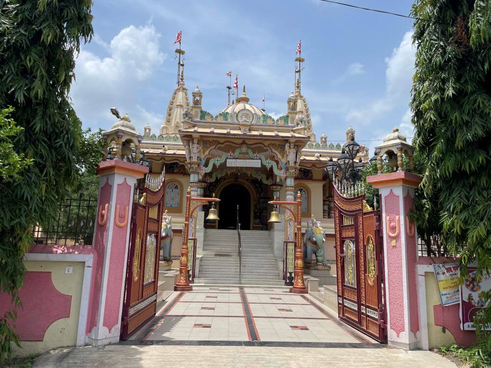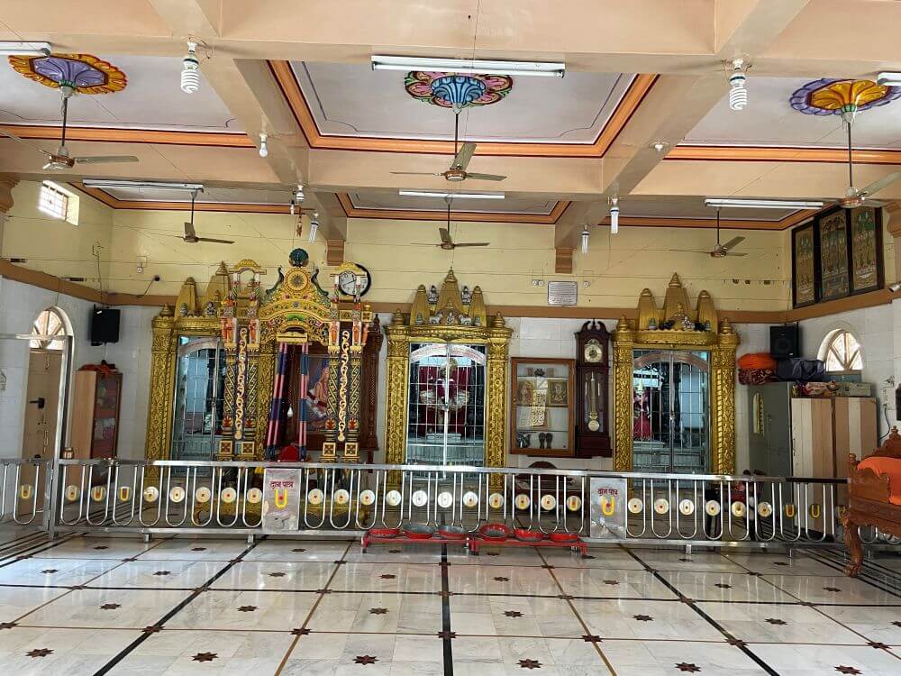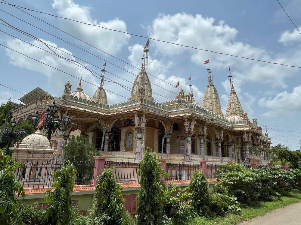 त्यावरील भाग मयूरनक्षीने सुशोभित आहे. गुळगुळीत संगमरवरी फरशा बसवलेल्या या सभामंडपास डाव्या व उजव्या बाजूंनीही प्रवेशद्वारे आहेत. समोरच मंदिराचे एक मुख्य व दोन उप अशी तीन गर्भगृहे आहेत. गर्भगृहांच्या द्वारचौकटी नक्षीदार सुवर्णरंगी स्तंभाने सुशोभित आहेत. उत्तरांग भागांत तीन छोटी शिखरे आहेत. मुख्य गर्भगृहात संगमरवरी अधिष्ठानावर हरिकृष्ण महाराजांची काळ्या पाषाणातील समपाद मूर्ती विराजमान आहे. या मूर्तीस गुजराती पद्धतीचे वस्त्रेप्रावरणे व मस्तकी फेटा आहे. डाव्या बाजूच्या उपगर्भगृहात उंच संगमरवरी वज्रपिठावर राधा-कृष्णाची, तर उजवीकडील उपगर्भगृहात लक्ष्मी-नारायणाची संगमरवरी मूर्ती प्रतिष्ठापित आहे. या उपगर्भगृहानजीक स्वामीनारायणांच्या प्रतिमा आणि पादुकांचे, तसेच बैठकीचे स्थान आहे. गर्भगृहांसमोरच्या जागेत सुंदर कोरीव व रंगकाम केलेला झुला आहे. गजशिल्पांवर उभारलेले स्तंभ, त्यांच्या शीर्षस्थानी वादकांची शिल्पे, त्यावरील भागात मेघडंबऱ्या, मध्यभागी त्रिकोणी बाशिंगासारखा भाग. त्यावर मयुरशिल्पे अशा प्रकारे हा झुला सजवलेला आहे. मंदिराच्या बाहेरच्या बाजूने ओवरीत प्रदक्षिणामार्ग आहे. येथील स्तंभांच्या शीर्षस्थानी विविध वादकांची शिल्पे आहेत. बाशिंगी छतावर छोट्या मेघडंबऱ्या आहेत. मंदिरास पाच उंच शिखरे आणि तीन घुमटाकार शिखरे आहेत.