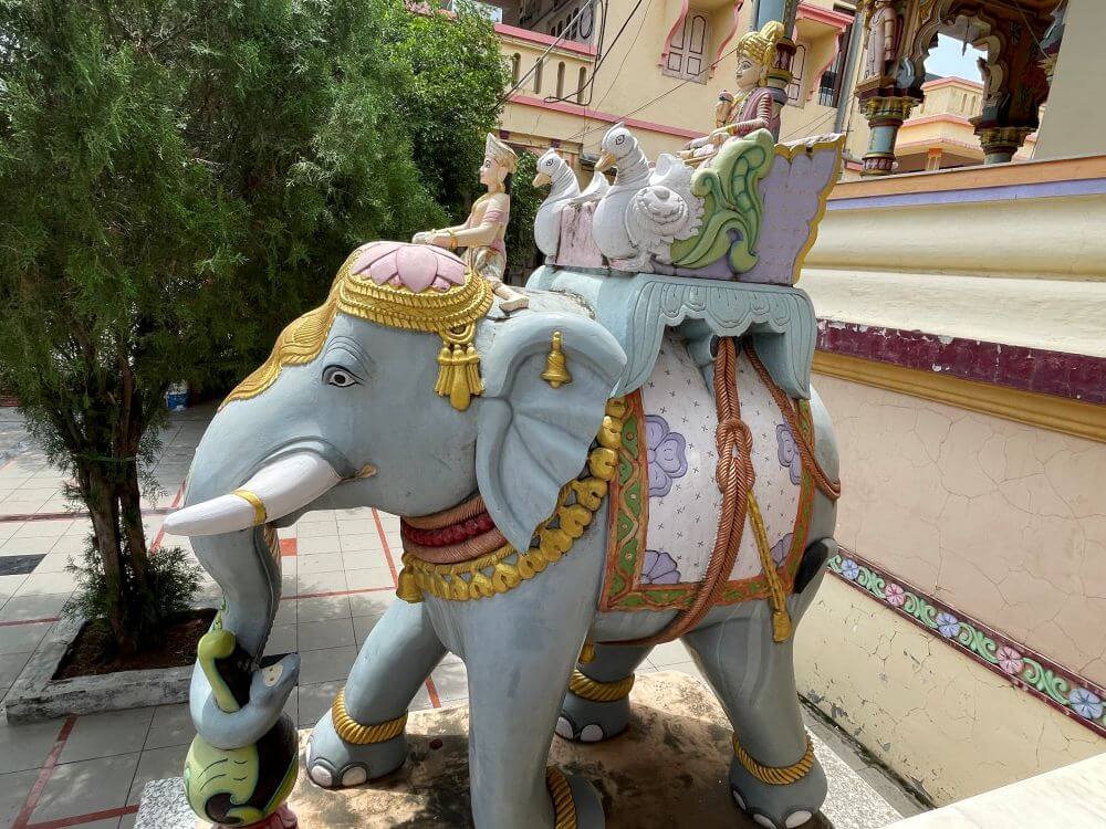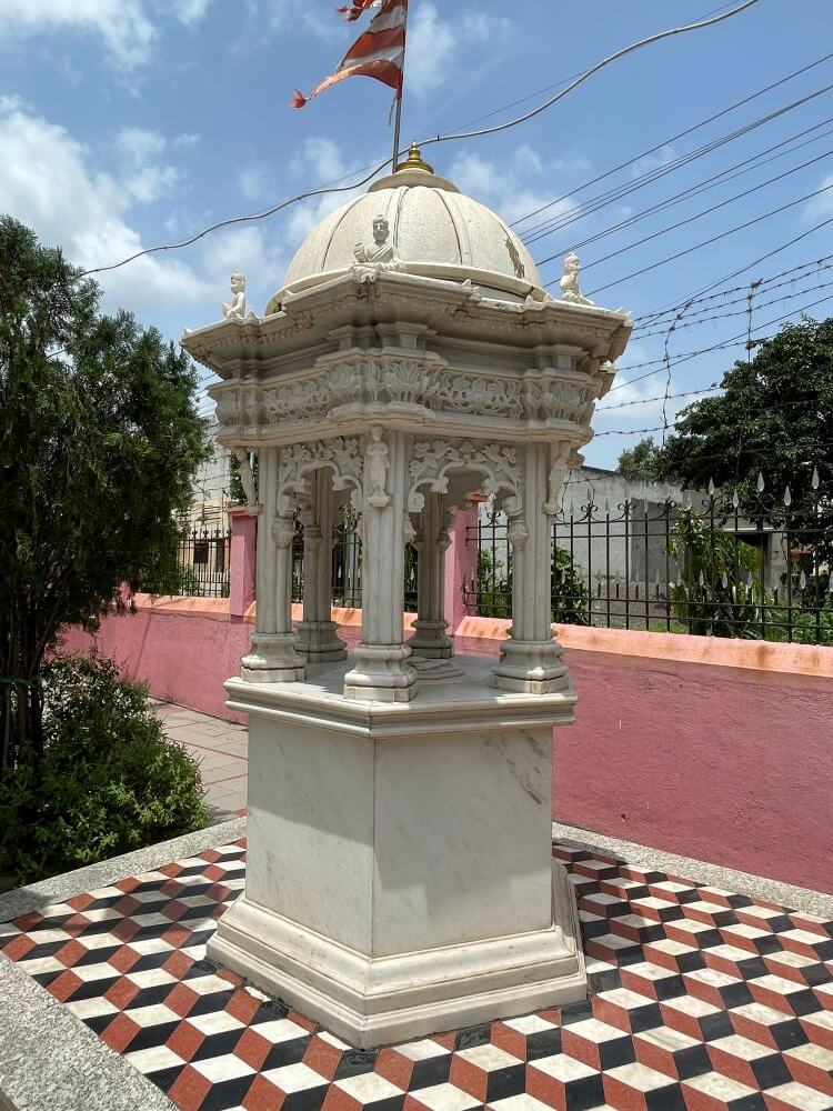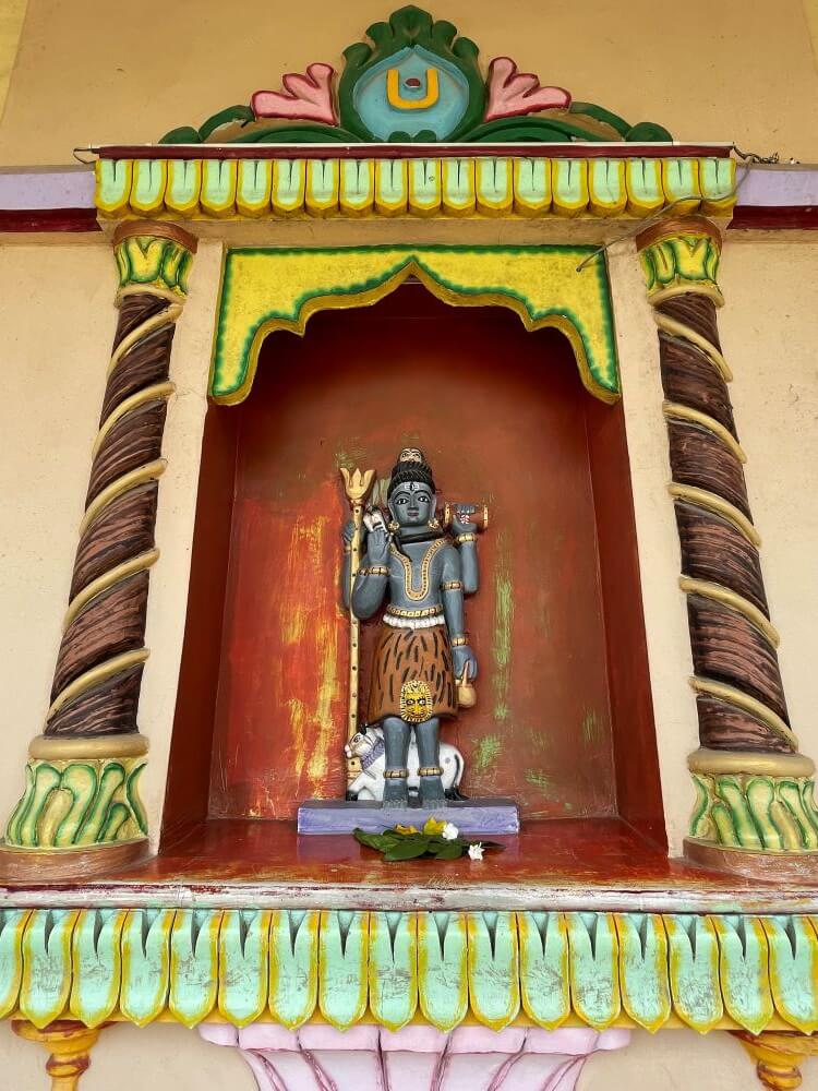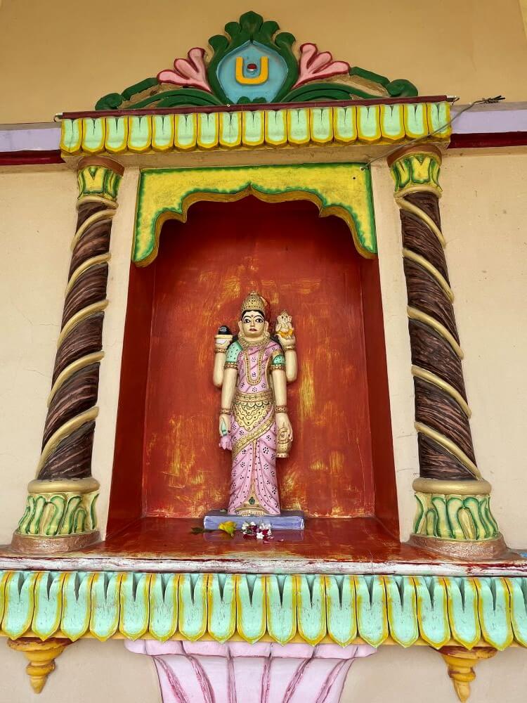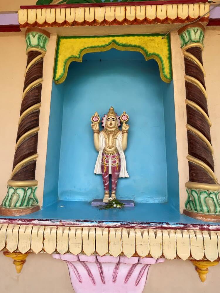 सभामंडपाच्या कमानदार प्रवेशद्वाराच्या दोन्ही बाजूंना द्वारपालांची रंगीत शिल्पे आहेत.