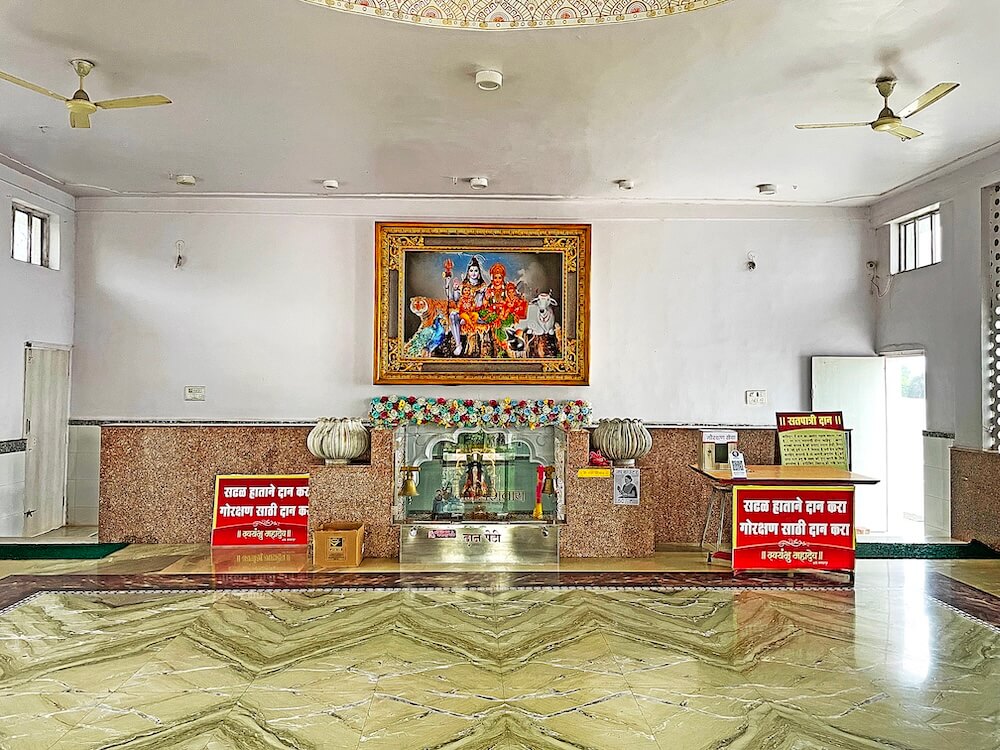 आकाराने मोठ्या असलेल्या या मंदिराच्या सभांमंडपात संगमरवरी फरसबंदी आहे. सभामंडपाच्या पुढील बाजूला गर्भगृहाच्या दर्शनी भिंतीवर शिवपंचायतनाची मोठी प्रतिमा आहे. या मंदिराची रचना काहीशी वेगळी आहे. सभामंडपाच्या बाहेरील बाजूने येथील खोलगट भागात असणाऱ्या गर्भगृहात येण्यासाठी दोन पायरी मार्ग आहेत. सुमारे आठ पायऱ्या उतरून गर्भगृहात प्रवेश होतो. या गर्भगृहाच्या प्रवेशद्वाराजवळ चौथऱ्यावर अखंड पाषाणातील नंदीची मूर्ती आहेत.