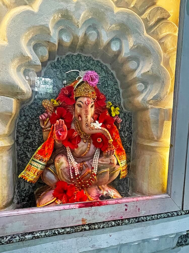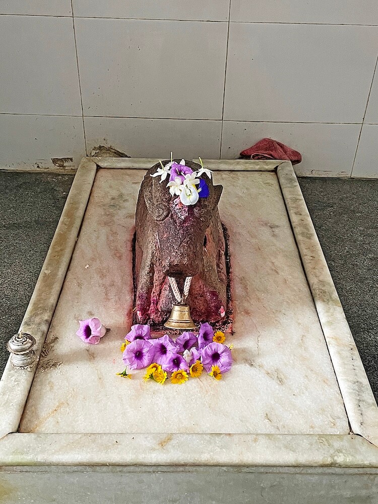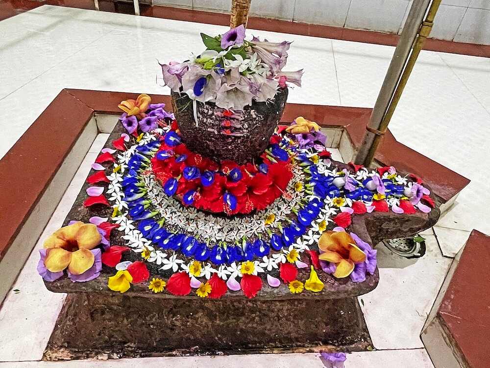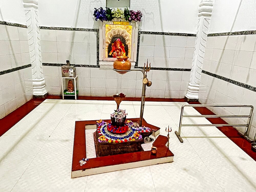 गर्भगृहात शुभ्र संगमरवरी फरसबंदी आहे. त्याच्या मध्यभागी अखंड पाषाणातील प्राचीन चौकोनी शिवपिंडी स्थित आहे. असे सांगितले जाते की या पिंडीवर निरखून पाहिल्यास त्यातून ‘ॐ’ चा आकार दिसतो. रामेश्वरम व राजस्थानातील एकलिंगनाथ येथील शिवपिंडीप्रमाणेच येथील पिंडी आहे. शिवपिंडीच्या मागील बाजूकडील भिंतीवरील देवकोष्टकात गणेशाचे स्थान आहे. येथील सभामंडपाच्या उजवीकडे व डावीकडे आणखी दोन मुखमंडप आहेत. येथील गर्भगृहावर मुख्य व उंच शिखर असले तरी येथील तीन मुखमंडपांवर तीन व सभामंडपावर एक अशी एकूण पाच शिखरे या मंदिरावर आहेत. गर्भगृहावरील मुख्य शिखरावर सुंदर व कोरीव नक्षीकाम आहे. शिखराच्या अग्रभागी दोन आमलक व कळस आहे. इतर सर्व शिखरांवर कमळपुष्पाच्या आकाराचे आमलक व कळस आहेत. याशिवाय मंदिराच्या छतावर अनेक मेघडंबरीसारख्या लहान लहान कलाकृती आहेत.