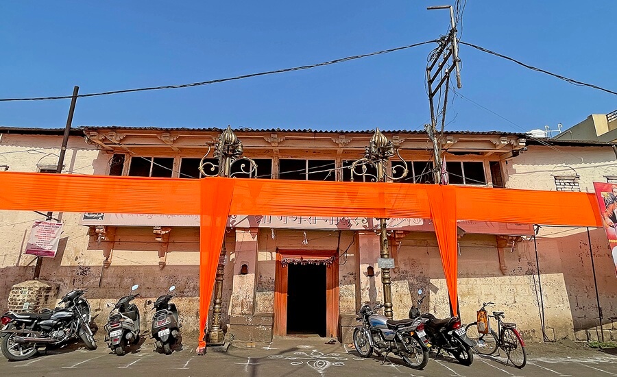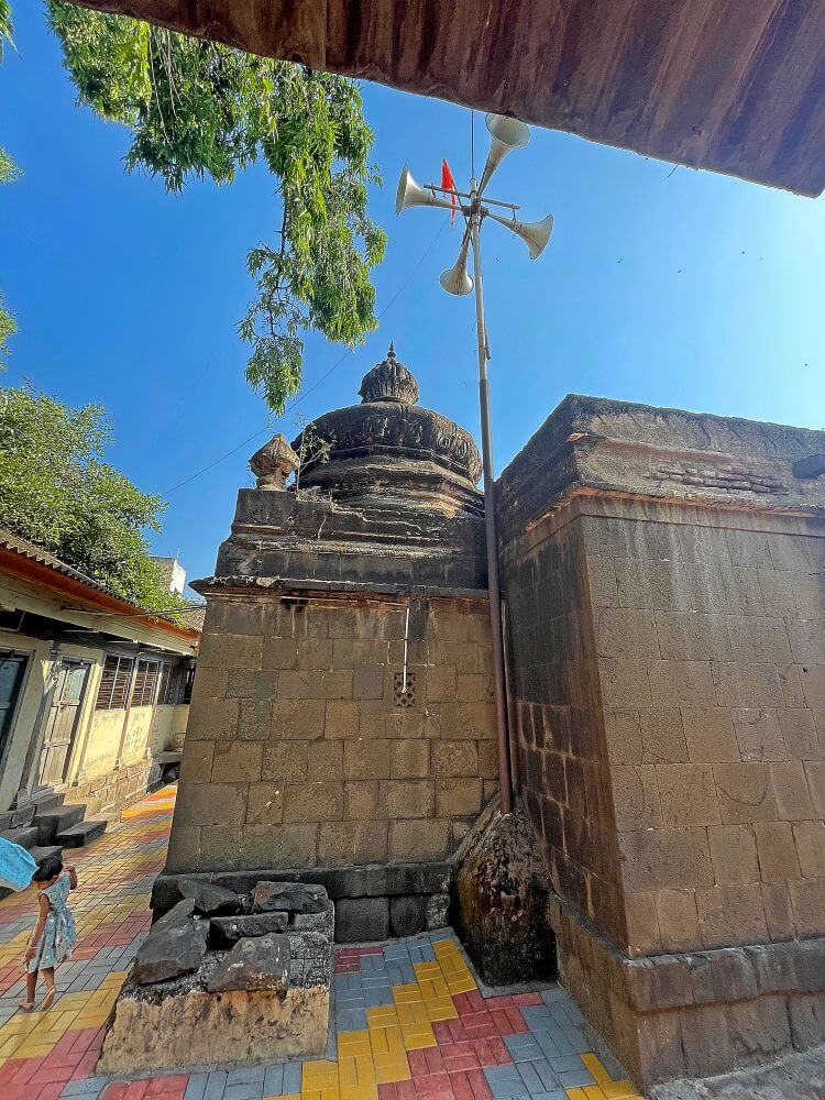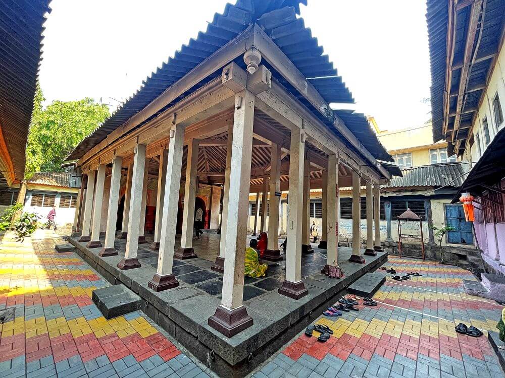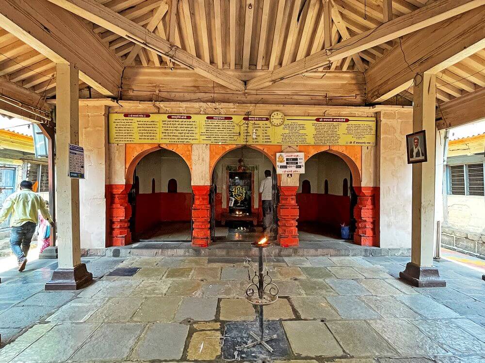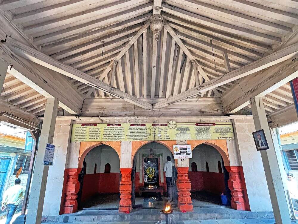 प्रवेशद्वार आहे. प्रवेशद्वाराच्या दोन्ही बाजूंस असलेल्या नक्षीदार स्तंभांत दीपकोष्टके आहेत. दुसऱ्या मजल्याच्या दर्शनी भिंतीत तब्बल १४ खिडक्या आहेत. प्रवेशद्वाराच्या नक्षीदार द्वारशाखांना शेंदूर लावलेला आहे. येथून पुढे मंदिराचे पेव्हर ब्लॉक लावलेल्या प्रांगणात प्रवेश होतो. सभामंडप, अंतराळ व गर्भगृह अशी या मंदिराची रचना आहे. खुल्या स्वरूपाच्या या सभामंडपात प्रत्येकी पाच चौकोनी लाकडी स्तंभाच्या चार रांगा व मध्यभागी चार लाकडी स्तंभ आहेत. सर्व लाकडी स्तंभ चौकोनी दगडी पायावर उभे आहेत. सभामंडपाच्या पुढे संपूर्ण दगडी बांधकाम असलेले हेमाडपंती स्थापत्यशैलीतील अंतराळ व गर्भगृह आहे. तीन अर्धचंद्राकार कमानींनी जोडलेले चार नक्षीदार स्तंभ असे अंतराळाच्या प्रवेशद्वाराचे स्वरूप आहे. अंतराळात गर्भगृहाच्या प्रवेशद्वाराच्या दोन्ही बाजूंस दीपकोष्टके आहेत. अंतराळातील मेजावर गणेशाची उत्सव मूर्ती आहे. येथून गर्भगृहातील गणेशमूर्तीचे दर्शन घ्यावे लागते. पुढे गर्भगृहाचे प्रवेशद्वार आहे. द्वारशाखांवर अस्पष्ट नक्षी व ललाटबिंबावर गणेशाची मूर्ती आहे. गर्भगृहात वज्रपिठावर गणेशाची चतुर्भुज मूर्ती आहे. काळ्या पाषाणातील ही मूर्ती अतिशय रेखीव