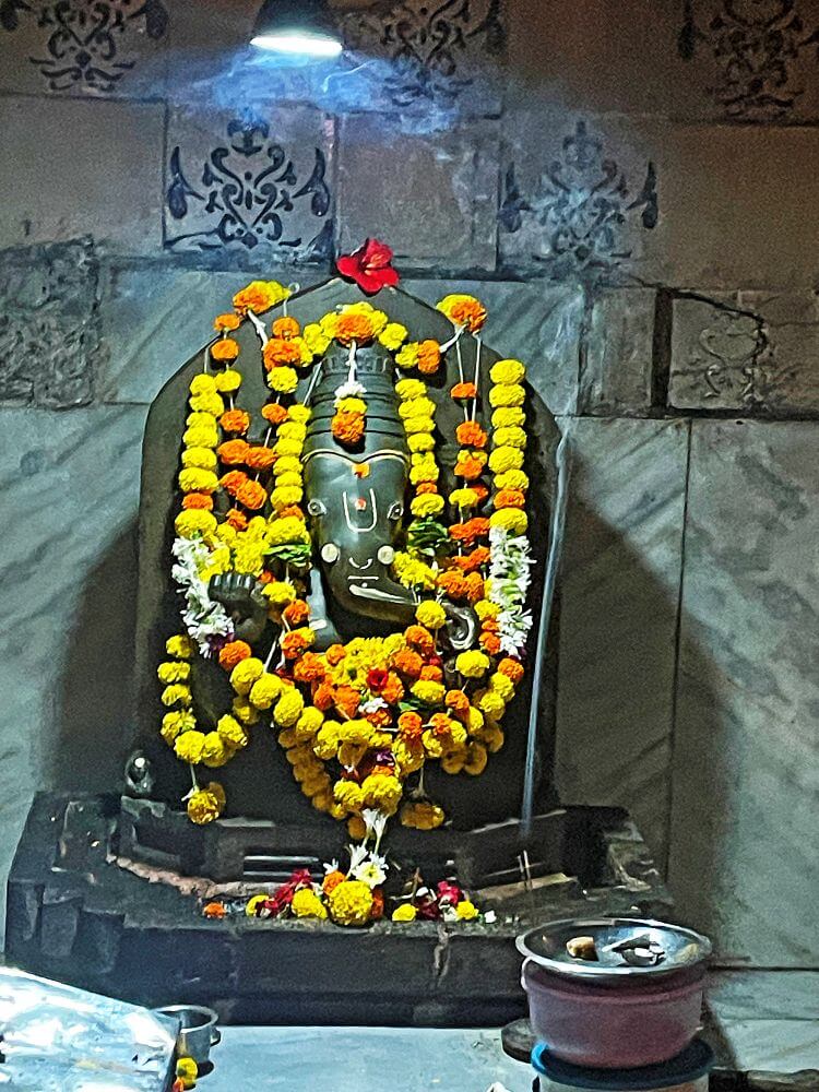 आहे. मूर्तीच्या मागील दोन हातात शस्त्र आहेत. उजवा हात आशीर्वादाचा तर डाव्या हातात मोदक अशी रचना आहे. मूर्तीचे कान आयतकृती आहेत. डोळे कोरीव व ठळक आहेत. सोंडेच्या बाजूचे दोन्ही दात अर्धे तुटलेले आहेत व उदरावर नाग आहे.