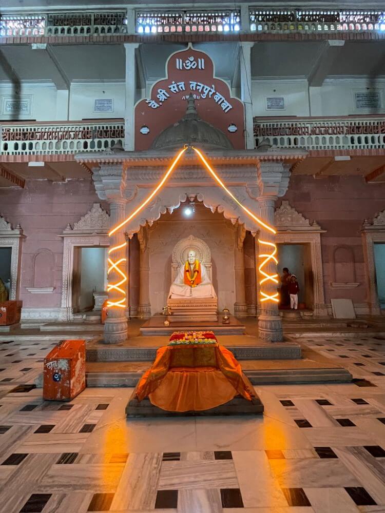 सभामंडपात डाव्या व उजव्या बाजूला प्रत्येकी सहा गोलाकार स्तंभ व त्यावर तुळई आणि दुसऱ्या मजल्याचा सज्जा आहे. सज्जावर गोलाकार व चौकोनी स्तंभ आणि त्यांवर छत आहे. वितानावर मध्यभागी चक्र व त्यात झुंबर आहे. सभामंडपात तनपुरे महाराजांची मूर्ती असलेला लहान रथ आहे. सभामंडपात महाराजांची समाधी व त्यापुढे दोन स्तंभ असलेल्या नक्षीदार मखरात वज्रपिठावर महाराजांची ध्यानस्थ मूर्ती आहे. सभामंडपात रांगेत अनेक गर्भगृहे आहेत. सर्व गर्भगृहांच्या द्वारशाखांवर पानाफुलांची नक्षी, ललाट बिंबस्थानी गणपतीची मूर्ती व मंडारकास चंद्रशिळा आहेत. सर्व गर्भगृहांत देवी देवता व साधू संतांच्या मूर्ती आहेत.