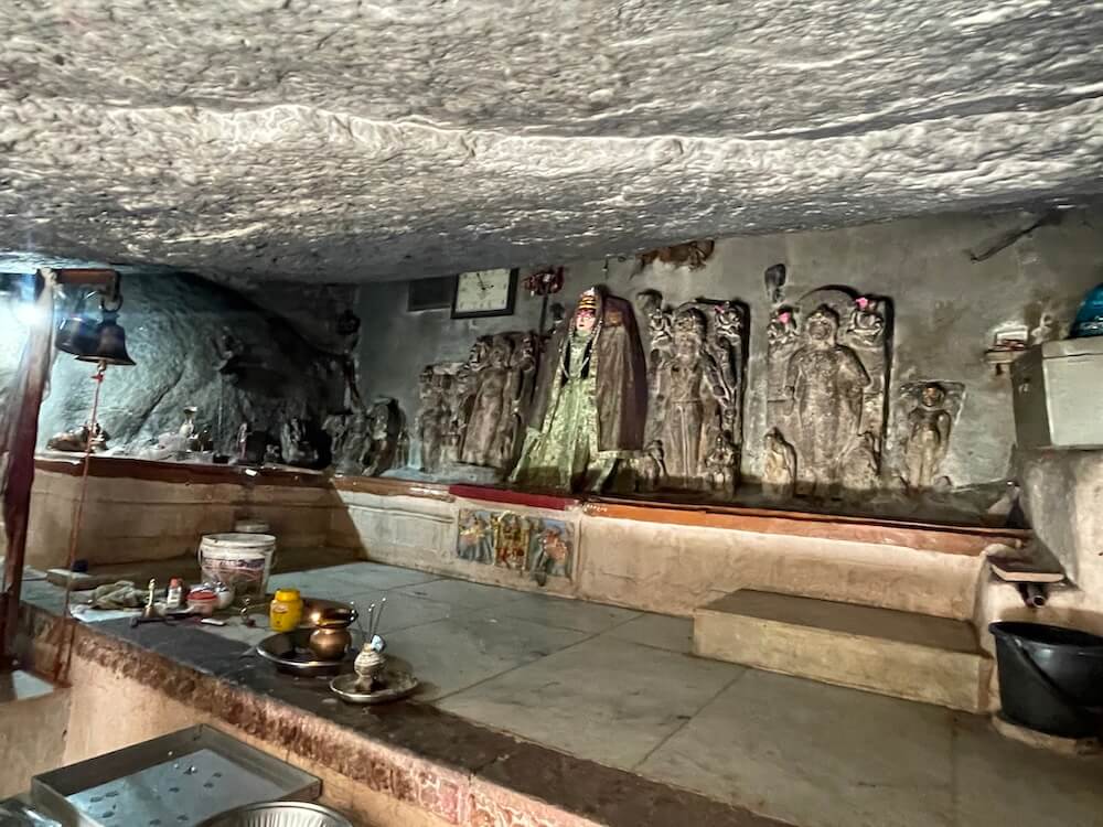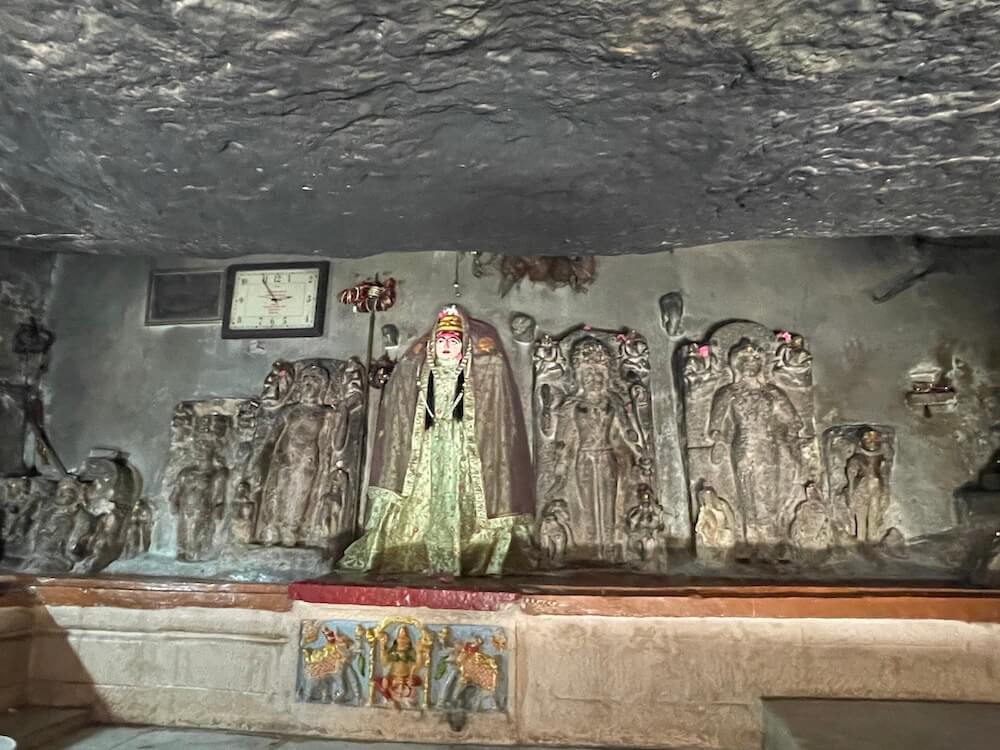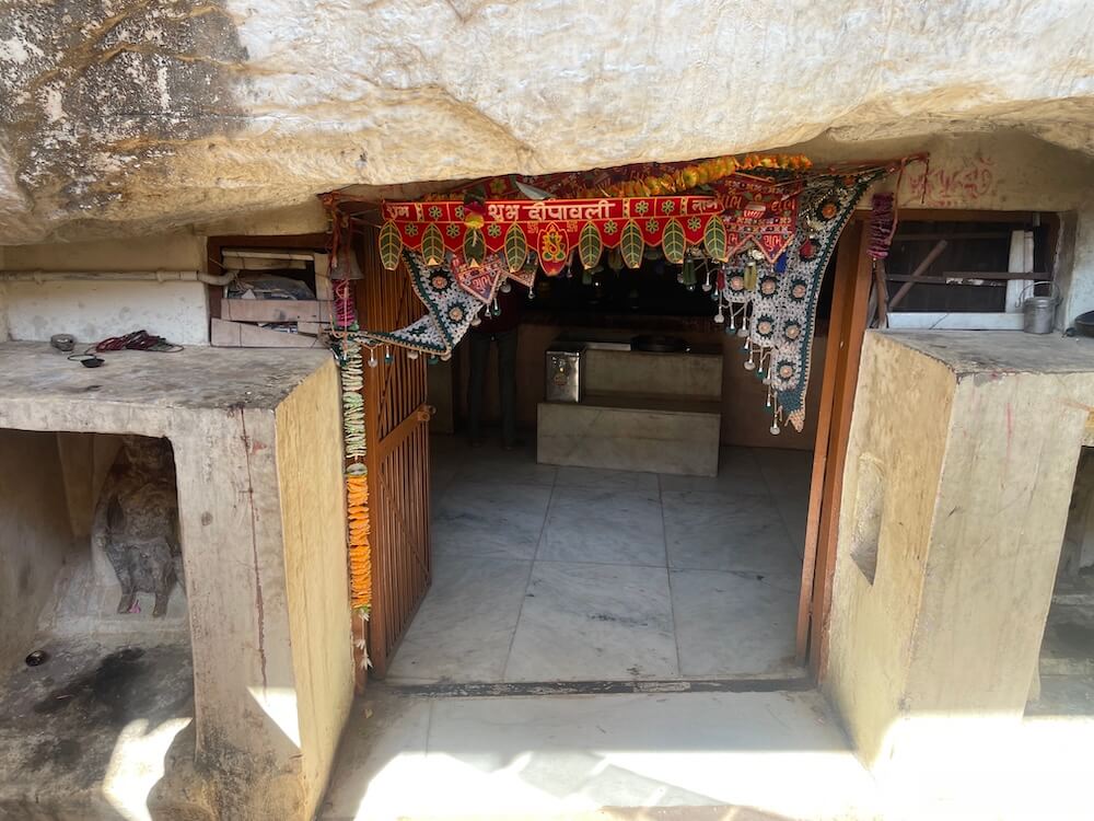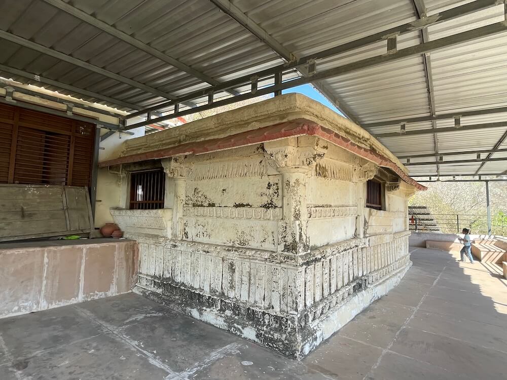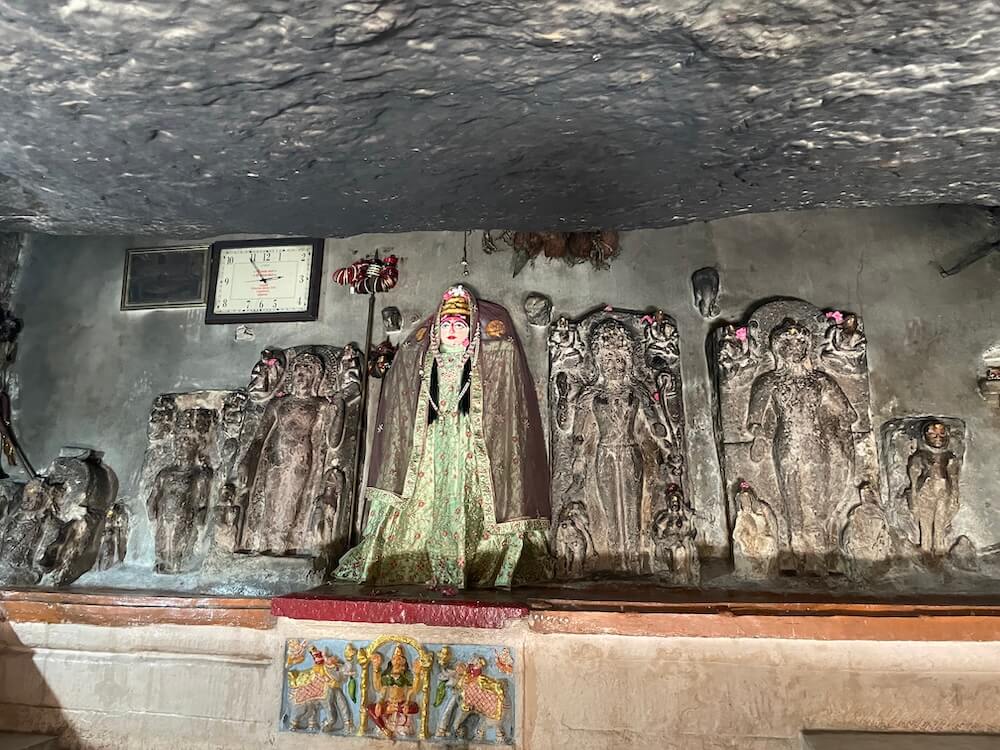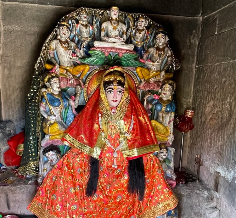 A short distance away, accessible by a narrow footpath, lies the modest shrine of Dharan Mata. Here, the idol of the Goddess is accompanied by a relief of her nine daughters. Carved at the center of these figures is a meditative form in the ‘Padmasana’ posture, believed to represent either Gautama Buddha or Lord Mahavira. Epigraphists suggest that the inscription beneath the idol of Dharan Mata bears a distinct connection to Buddhist tenets.