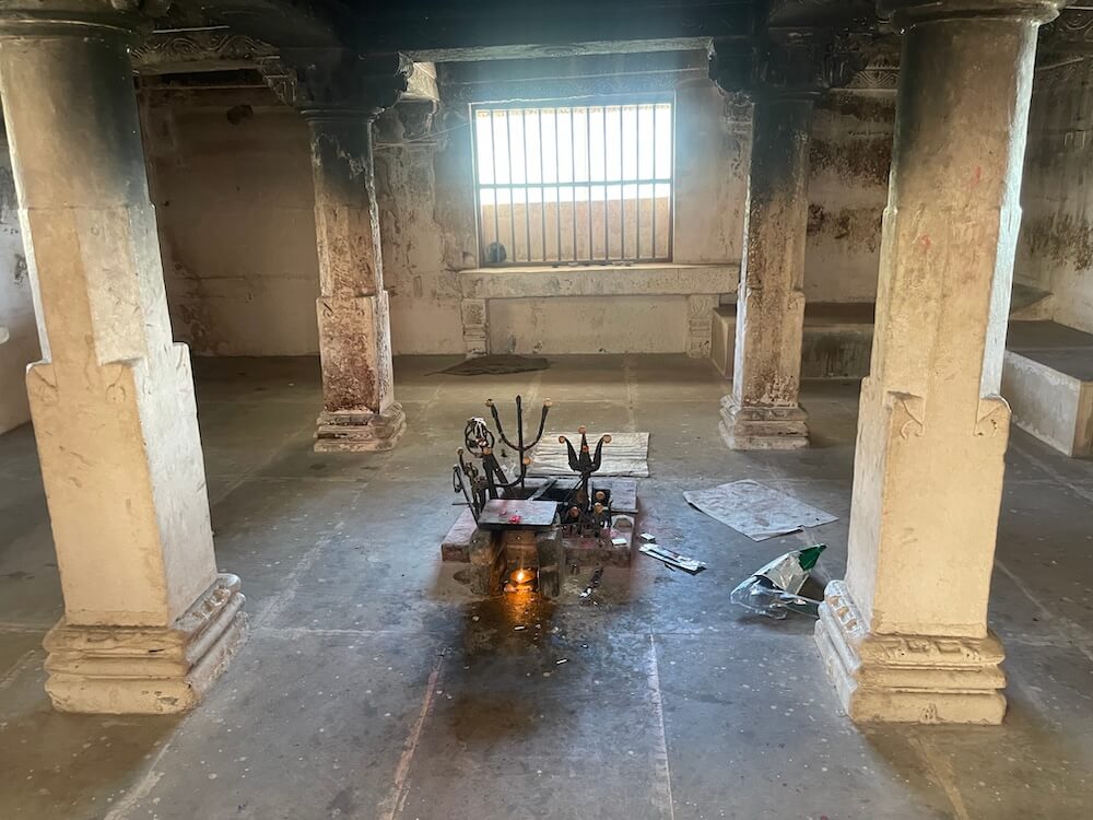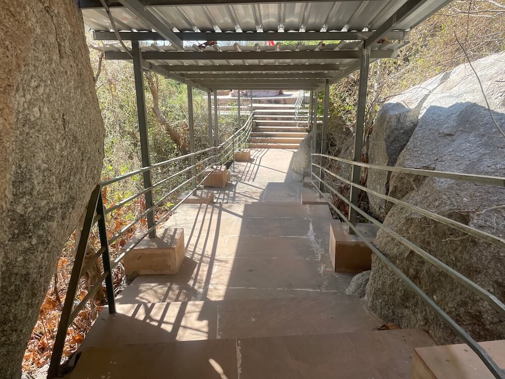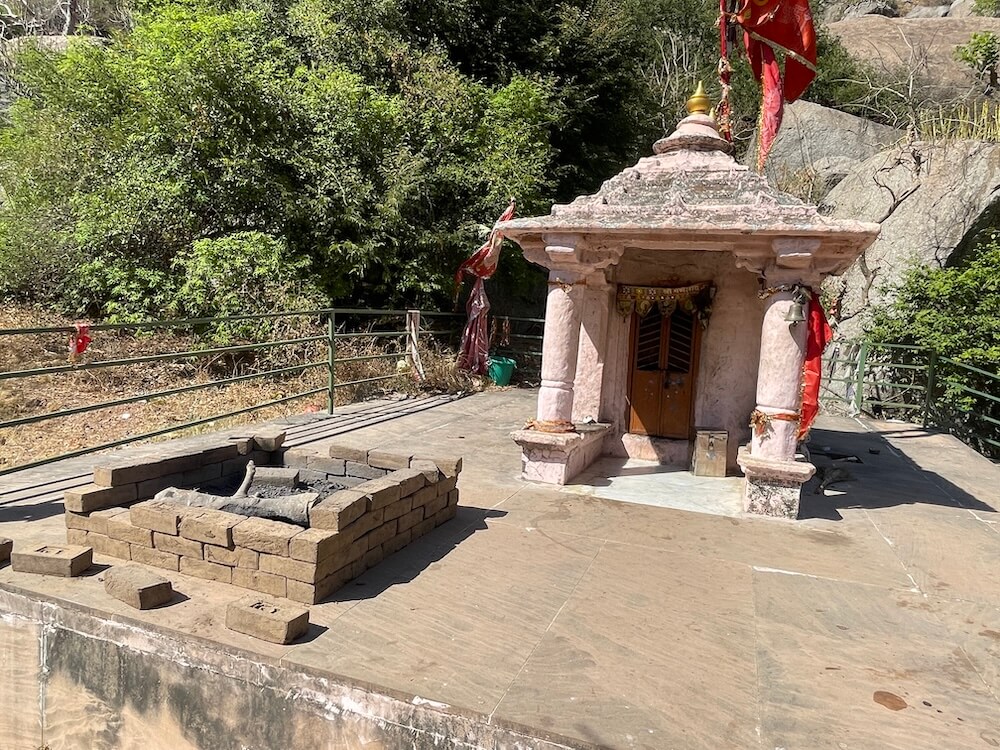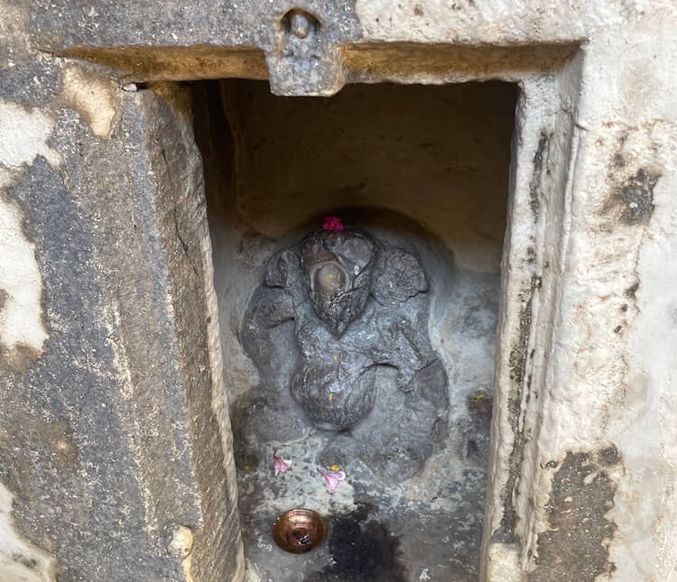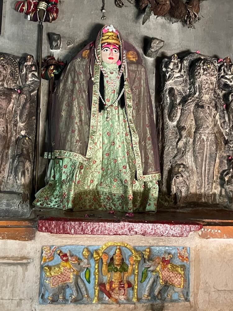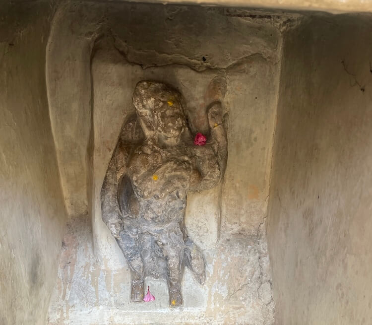 A short distance away, accessible by a narrow footpath, lies the modest shrine of Dharan Mata. Here, the idol of the Goddess is accompanied by a relief of her nine daughters. Carved at the center of these figures is a meditative form in the ‘Padmasana’ posture, believed to represent either Gautama Buddha or Lord Mahavira. Epigraphists suggest that the inscription beneath the idol of Dharan Mata bears a distinct connection to Buddhist tenets.