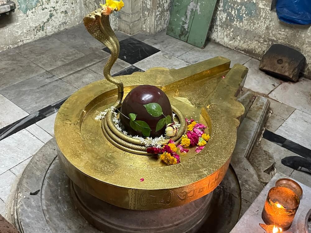 Inside, the sanctum houses a substantial Shiva lingam placed atop a golden disc. This lingam is distinctive in form and structure, divided into three levels, i.e. Brahma-bhaga, Vishnu-bhaga and Rudra-bhaga. Typically, the lower two sections are buried underground, but here they rise above ground level; remarkably, even the Brahma section has a visible disc. The Rudra portion forms a tall cylindrical projection, crowned with a pancha-dhatu snake and an abhishek vessel. On the rear wall niche of the sanctum sits a carved figure of Parvati, mirroring the entrance motifs.