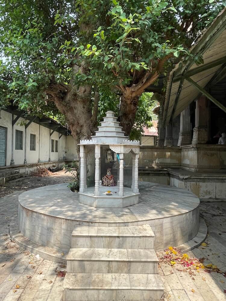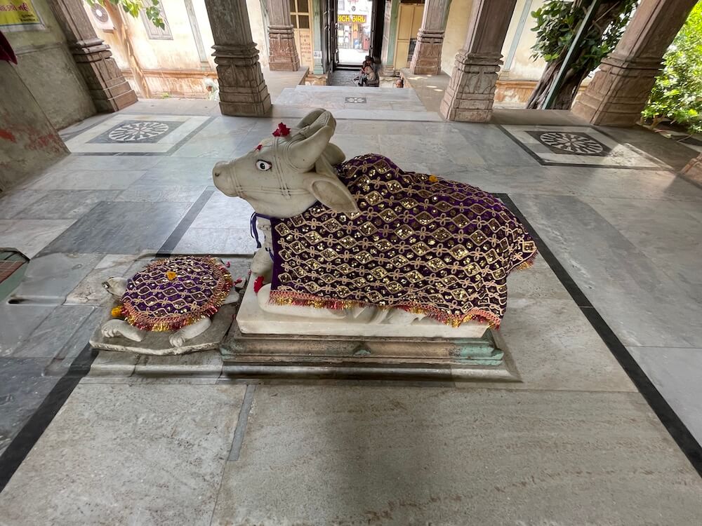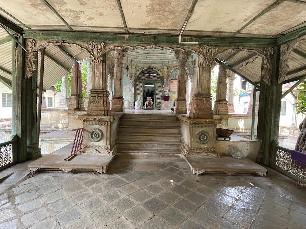 In front of the temple stands an open wooden hall erected for religious ceremonies and public gatherings. The walls here display two portraits of Sayajirao Gaekwad III. A few steps lead up to the central entrance hall, whose side aisles are approached via ten steps each. Pillars and ceilings exhibit exquisite carving work, with arches (mahirapi kamani) adorning the supports. In the assembly hall stands a carved marble Nandi facing a tortoise pedestal.
