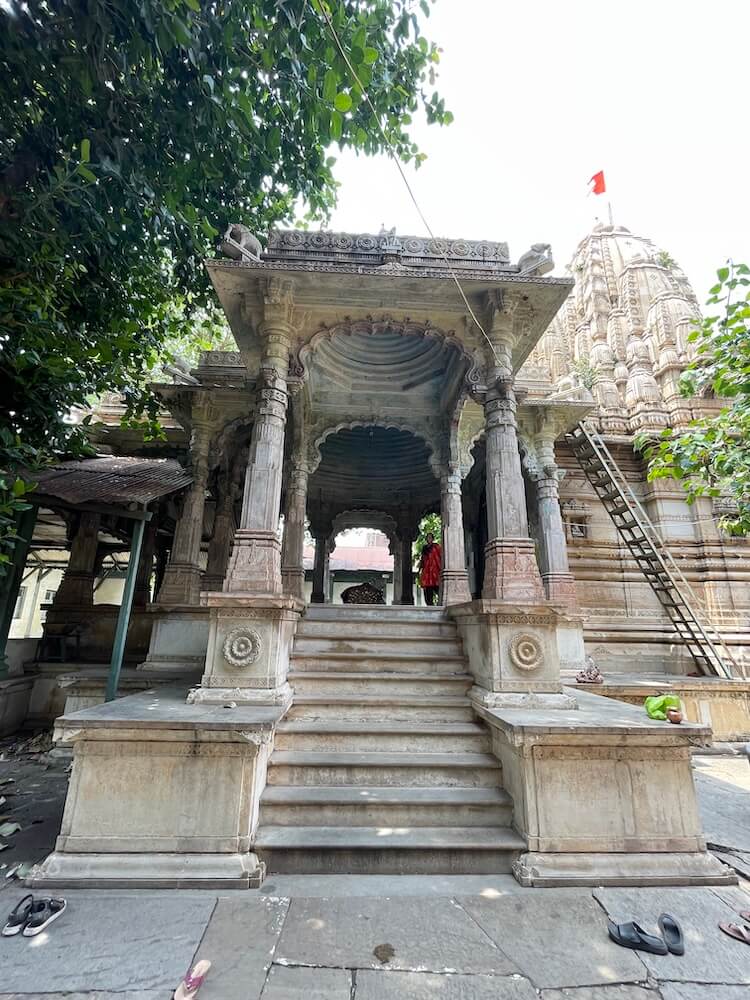 The temple is situated within the expansive courtyard of a grand double-storied bungalow on the northern bank of Sursagar lake, adjacent to Jubilee Garden. Entering through the stone gateway of the old mansion, one immediately beholds the majestic temple raised on its terrace. Its structure comprises a mukhamandap (entrance hall) on three sides, followed by a sabhamandap (assembly hall), an antaral (vestibule) and the garbhagriha (sanctum). The mukhamandap and sabhamandap are surmounted by dome-shaped spires, while the sanctum is topped by a tall urushringa-style shikhara with an amalaka disc and a kalasha atop. Ornate features like cornices, lion sculptures and carved deities in the shrine niches enhance the aesthetic appeal. Intricate sculptures of deities adorn the external walls as well.