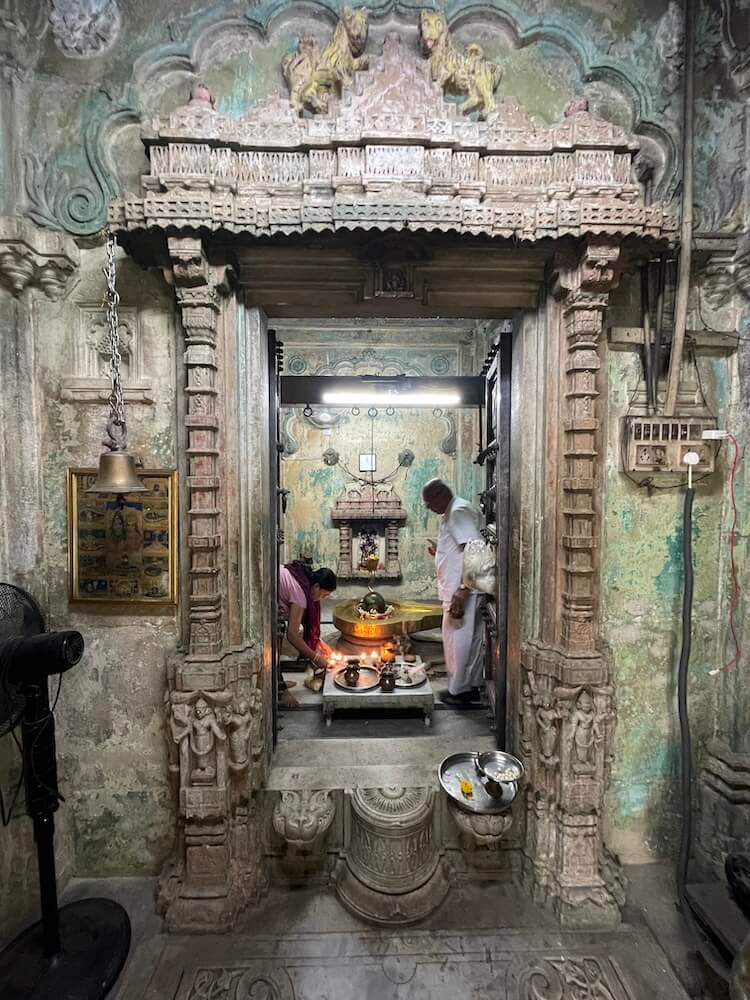 The antaral is accessed through a wooden latticed door. Within, the left shrine niche houses a marble idol of Ganesha, while the right niche holds a marble Hanuman figure. These niches echo the shrine layout of the main sanctum. The sanctum is entered via a trishakha-shaped (three-arched) stone doorway richly carved with guardian figures, attendant deities (sevika), demon heads (kirti mukha) on the lintel and Lord Ganesha in the upper pediment. Above the door is a miniature crown-like spire flanked by twin tiger sculptures.