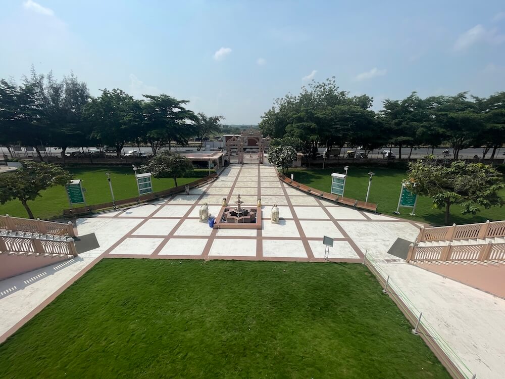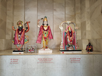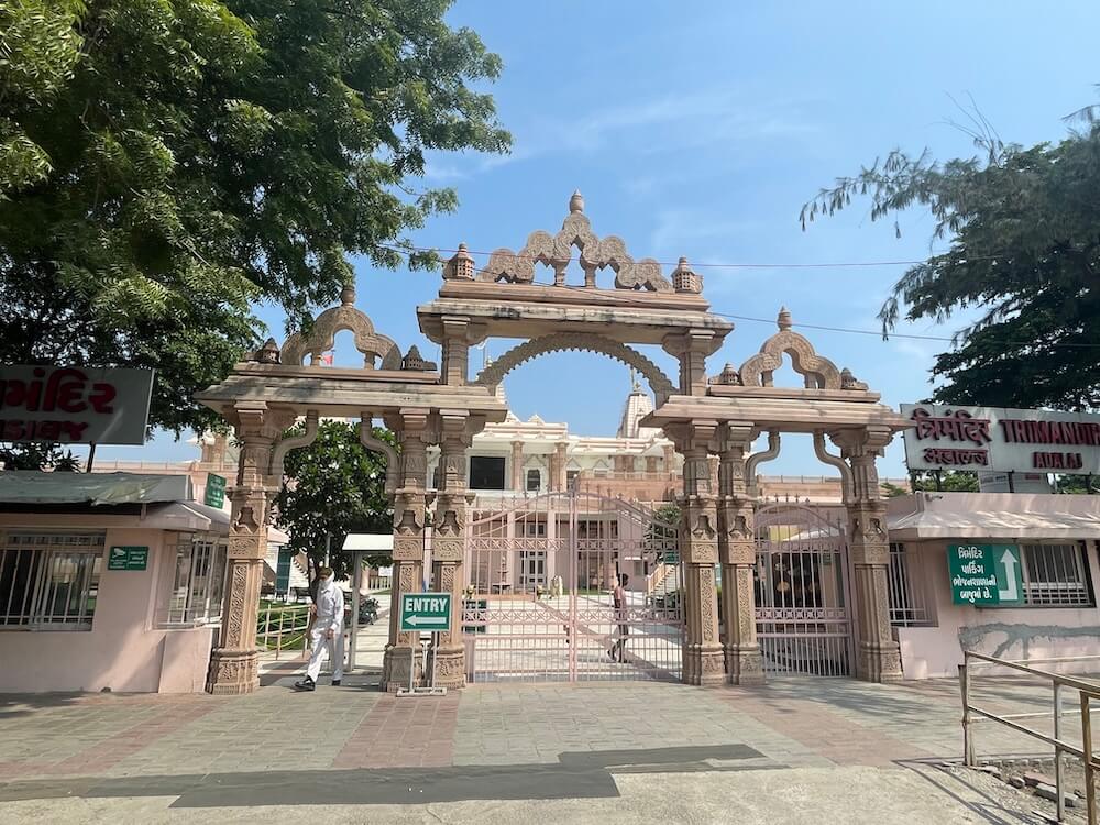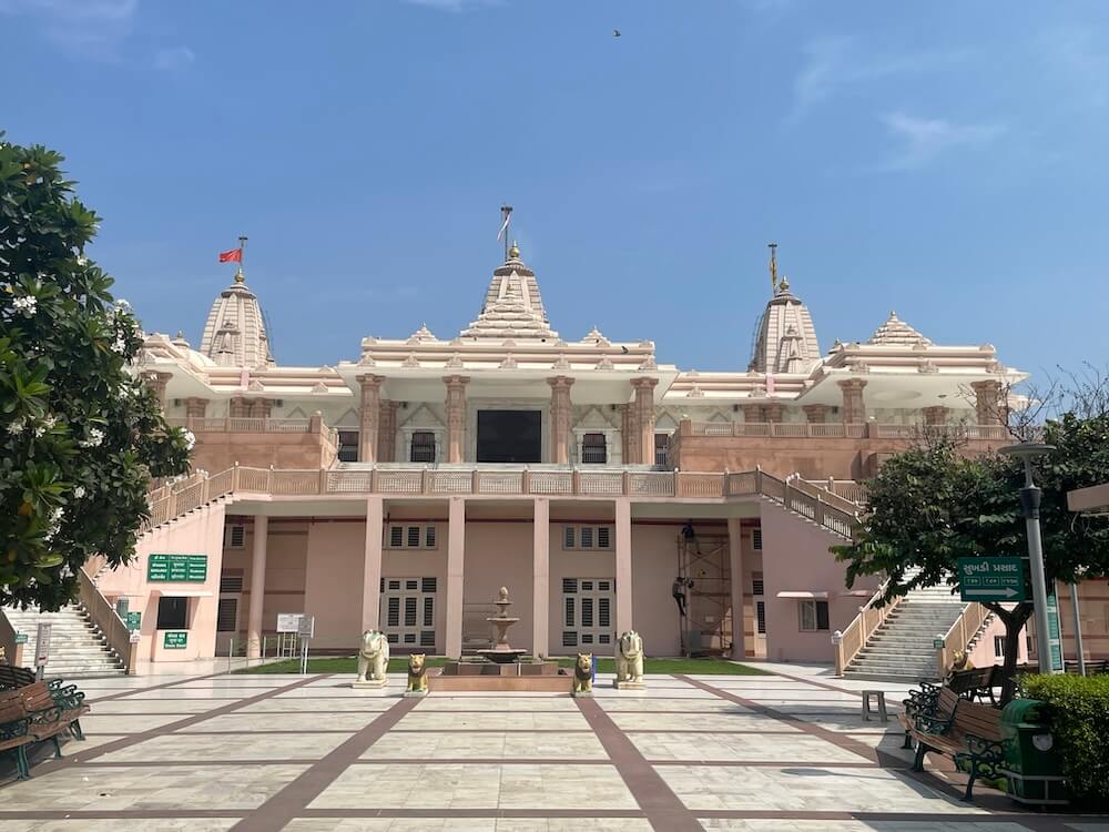 One such temple lies about 10 km from Gandhinagar, on the Ahmedabad-Kalol highway, within a vast complex. Constructed in 2002 from white marble, this two-storey temple stands on 40,175 sq ft surrounded by lush greenery. A grand fountain, flanked by lion and elephant sculptures, adorns the entrance. True to the Trimandir style, the lower floor houses a 31,861 sq ft satsang hall, while the main temple is located on the upper floor.
