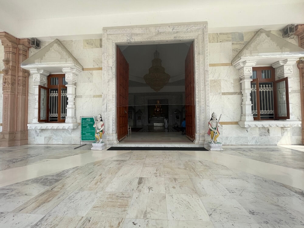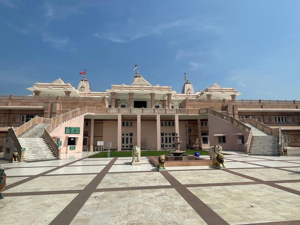The massive gateway features Dwarpals (divine gatekeepers). The atmosphere inside the central hall is serene and uplifting, enhanced by a giant chandelier at the center of the 10,000 sq ft sabhamandap.