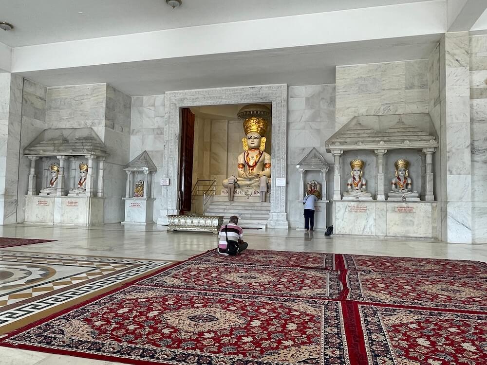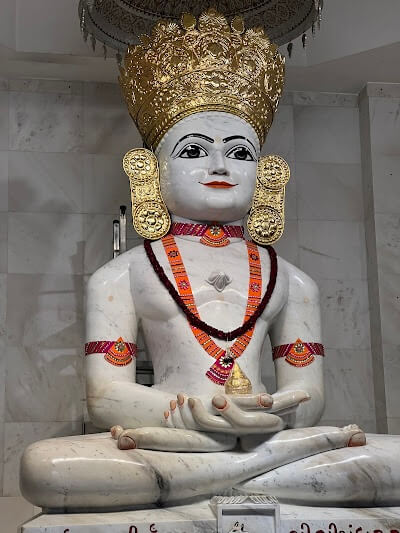 In the sanctum at the center is a 13-foot-tall marble idol of Simandhar Swami. To the left are temples of Chandrayana Yaksha and Panchaguli Devi. Smaller shrines house Lord Mahavir and Lord Parshvanath. Nearby are idols of Lord Ajitnath and Lord Rishabhdev. On the right is Chakreshwari Devi, with a large image of Dada Bhagwan and his Paduka (sacred footprints) in front. Further right is Vishnulok, containing idols of Shrinathji, Lord Krishna and Tirupati Balaji. To the left of Krishna’s idol is a cradle with Bal Krishna.