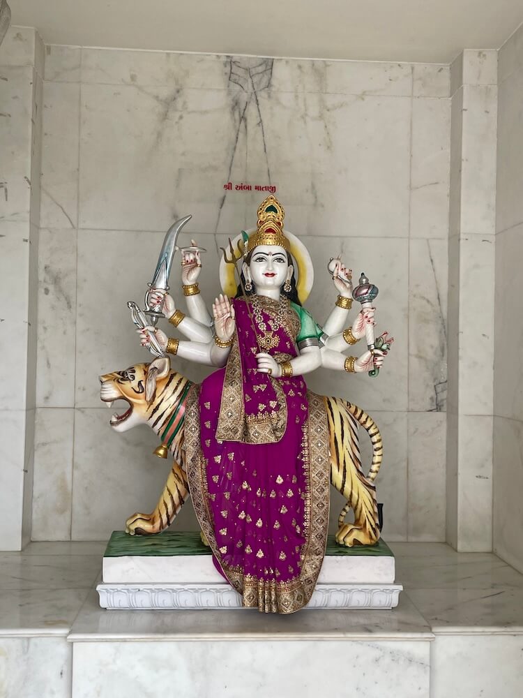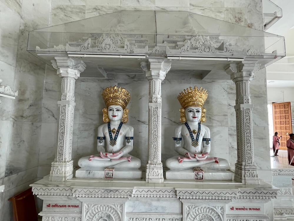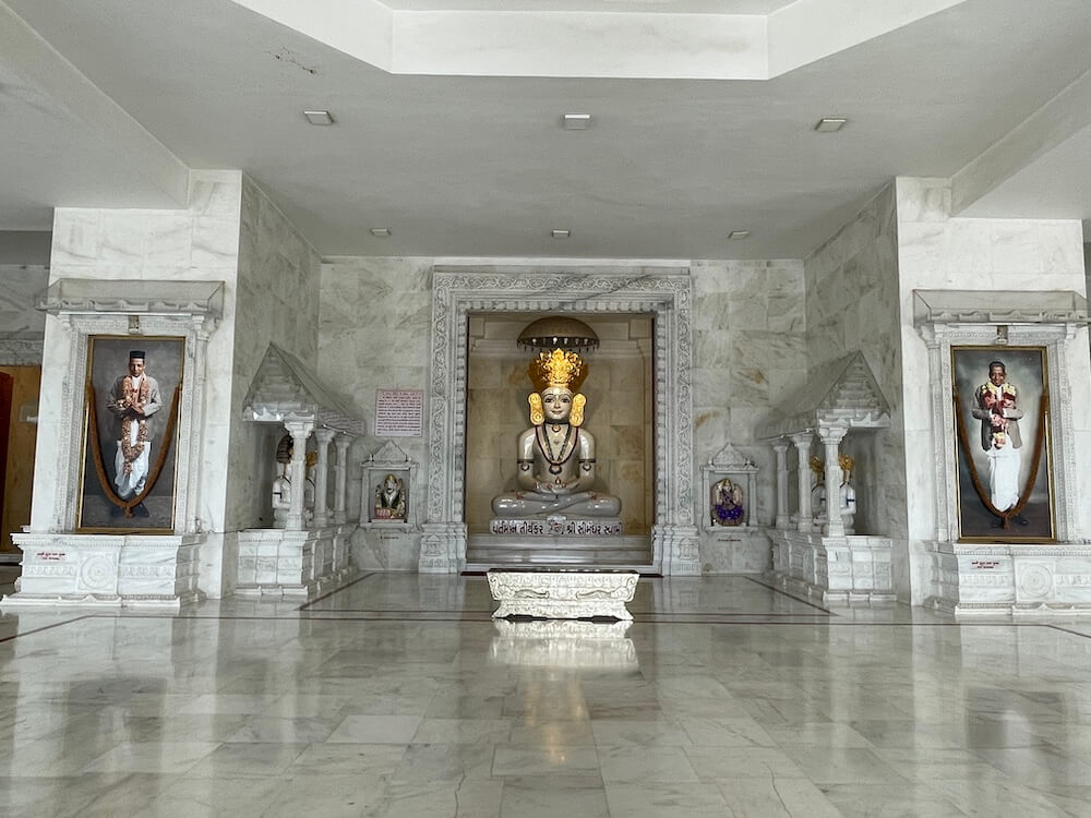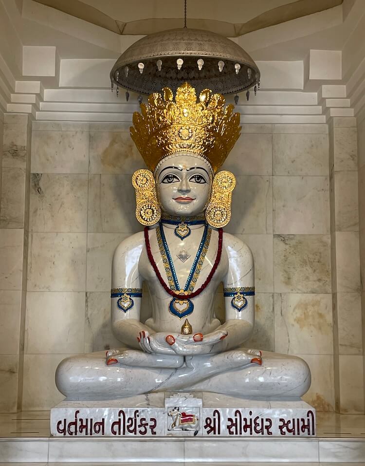 Directly ahead is the sanctum housing a 13 feet-tall marble idol of Jain Tirthankar Simandhar Swami, crowned in gold and shaded by a ceremonial canopy. According to Jain belief, Simandhar Swami is a living Tirthankar, currently residing in a parallel world known as Mahavideh Kshetra. Jain traditions hold that he was born during the era of the 17th and 18th Tirthankaras, Kunthunath and Arahanath. His physical form is said to be 1,500 feet tall, his age is believed to be 150,000 years and he is destined to live for another 125,000 years.