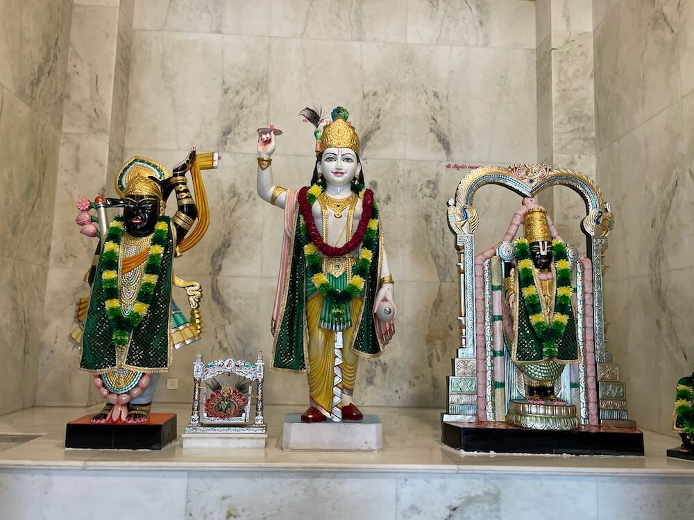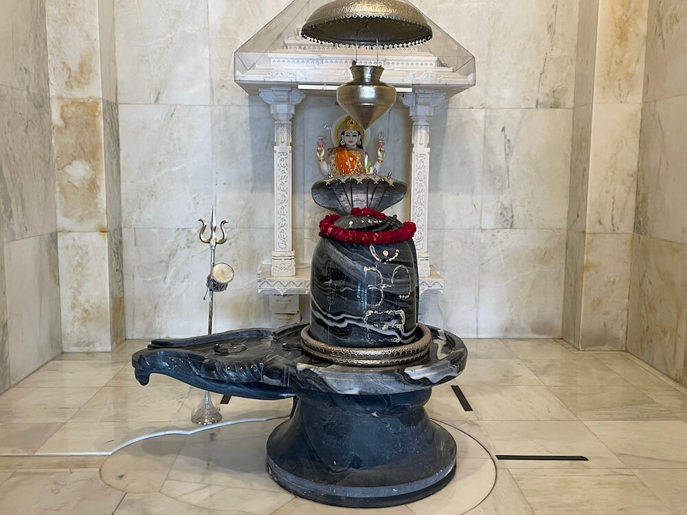 Outside this sanctum are shrines to Chandrayan Yaksha Dev and Panchanguli Yakshini Devi. Along the adjacent walls are idols of Bhagwan Mahavir, Bhagwan Parshvanath, Bhagwan Ajitnath and Bhagwan Rishabhdev. Near this sanctum is an image of Dada Bhagwan. To the left is Shivlok, the Shaiva section, with Nandi and the sacred turtle placed in front of the sanctum. Here, shrines of Ganesha and Hanuman are also present. The central feature is a Shivling, over which a serpent holds a protective hood. Behind the Shivling is a sculpture of Parvati Mata. On the right side of Simandhar Swami’s sanctum is Vishnulok. Outside this sanctum are shrines to Bhadrakali, Chakreshwari and Mahakali. Inside the sanctum, placed on a raised platform, are idols of Shrinathji, Shri Krishna and Tirupati Balaji arranged from left to right.