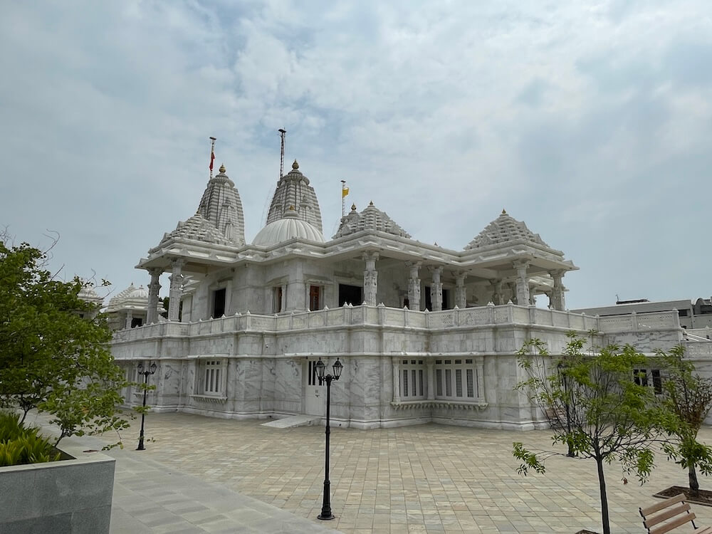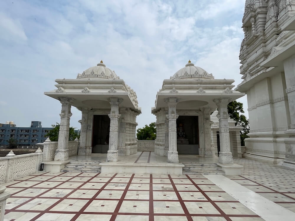 After ascending five steps, one reaches the marble-paved courtyard, where a grand white marble temple structure stands prominently. The base area of the temple alone spans 9,010.68 square feet. The main shrine lies on the upper floor of this two-storey building. Like other Trimandirs, it features an antarala (inner porch), ovaris (side galleries), an assembly hall and garbhagrihas (sanctums). Pyramid-shaped domes crown the porches and side galleries, while three large domes sit atop the main assembly hall. The sanctums rise with tall Urushringa-style spires, each topped with golden kalashas.