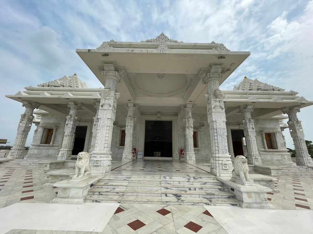 The Trimandir in Vadodara was built in 2017. Visitors enter the temple through a tall iron gate decorated with carved pillars.