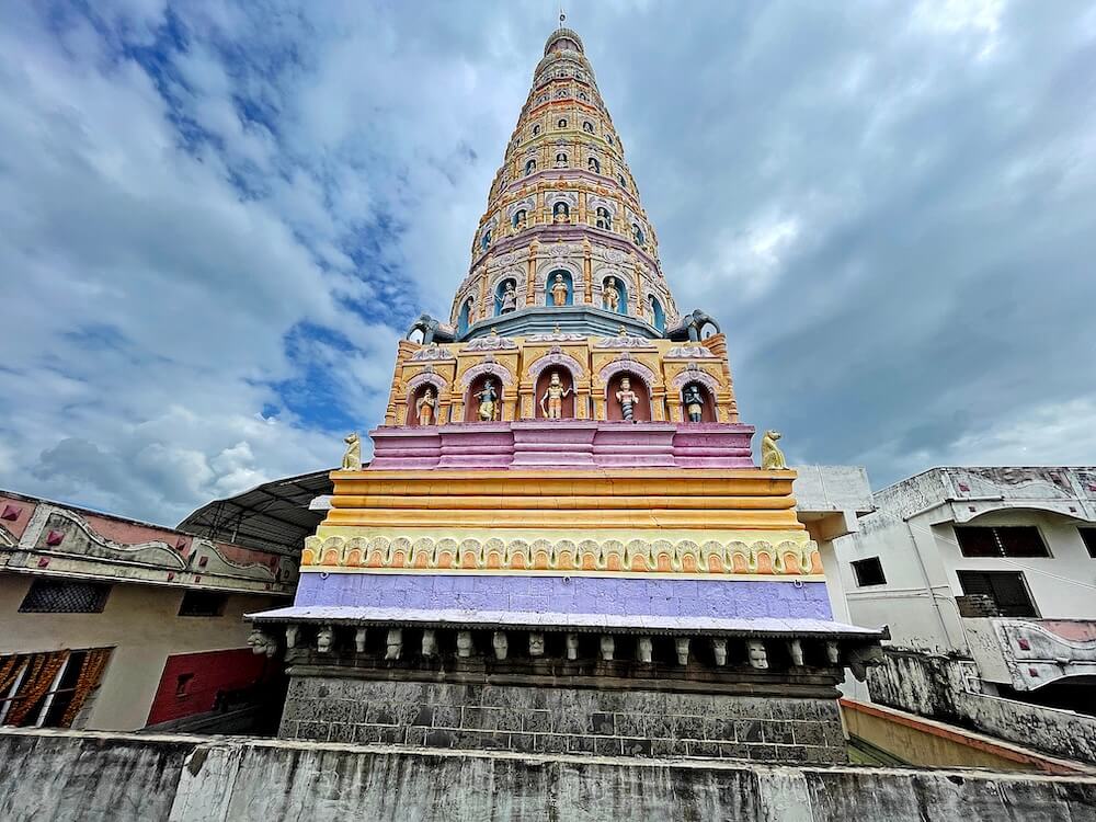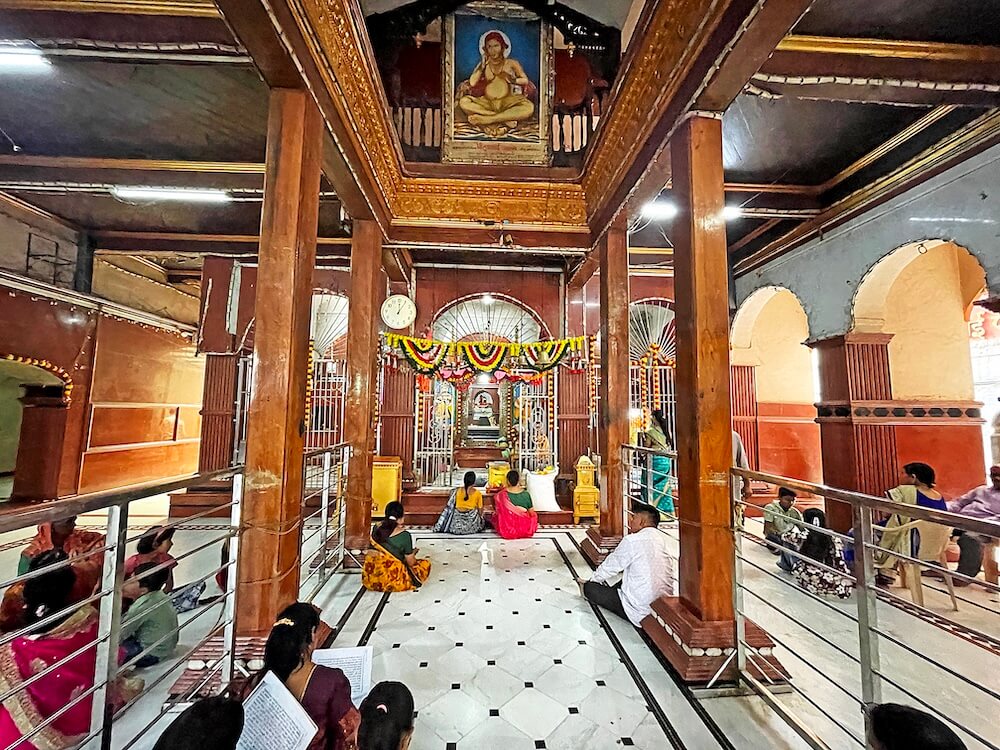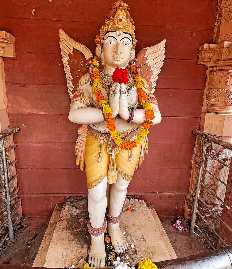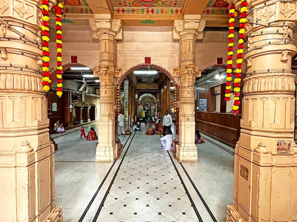 सभामंडपात स्तंभांच्या चार रांगा आहेत, तसेच डाव्या बाजूला रजतपटल (चांदीचे) आच्छादन केलेला गरुडस्तंभ आहे. या स्तंभावर वेगवेगळ्या देवी-देवतांची शिल्पे कोरलेली आहेत. सभामंडपातील मधल्या दोन रांगांतील स्तंभ लाकडी आहेत, तर बाह्यबाजूच्या स्तंभांवर अर्धचंद्राकार कमानी आहेत. सभामंडपात स्टेनलेस स्टीलचे कठडे लावून रांगांचे व्यवस्थापन केलेले आहे.